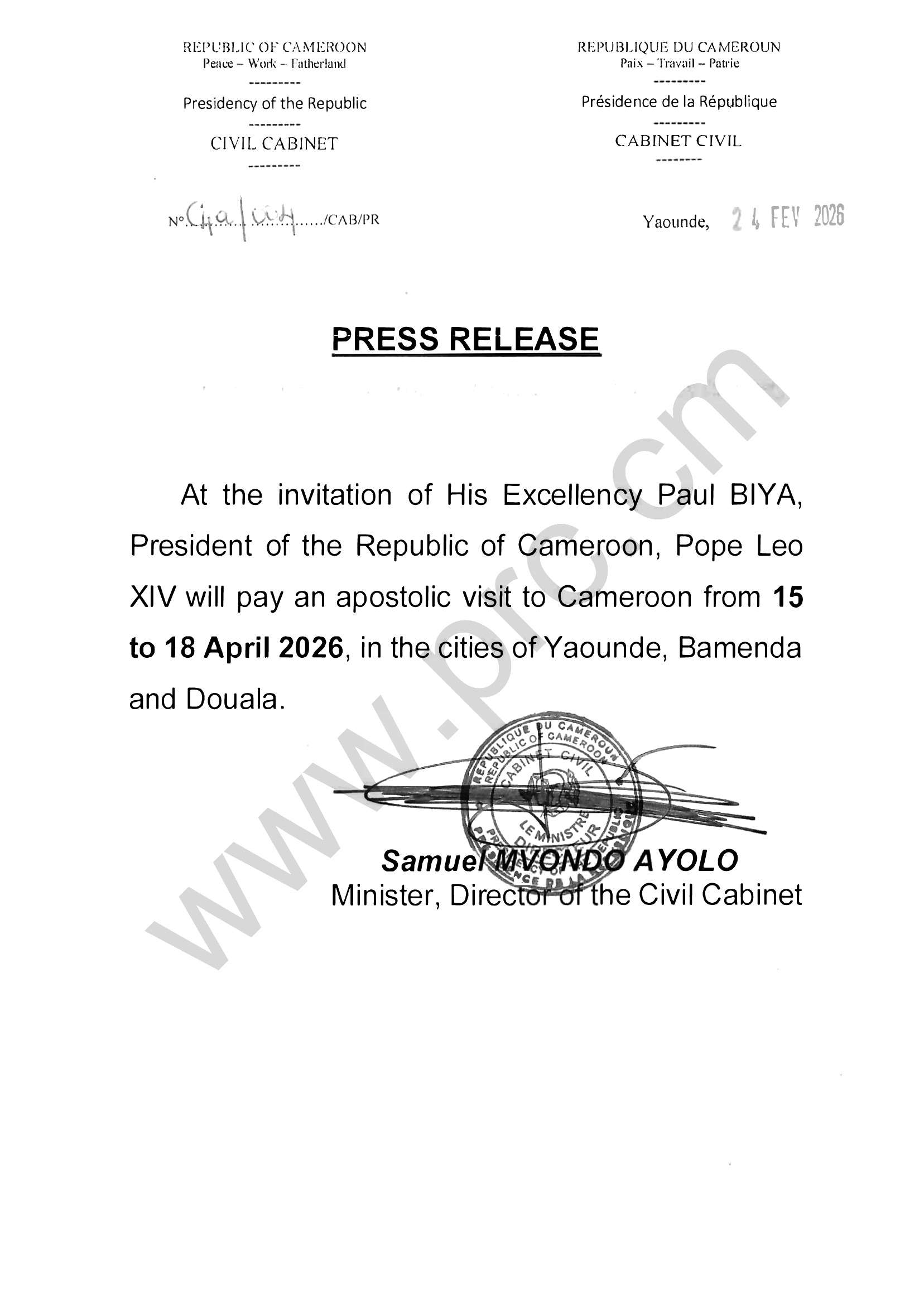 Press release - Apostolic trip to Cameroon of Pope Leo XIV Print Tweet AUDIENCE NEWS DOCUMENTS SPEECHES AUDIO VIDEOS PHOTOS LIVE -- DOCUMENTS -- < Prev Next >