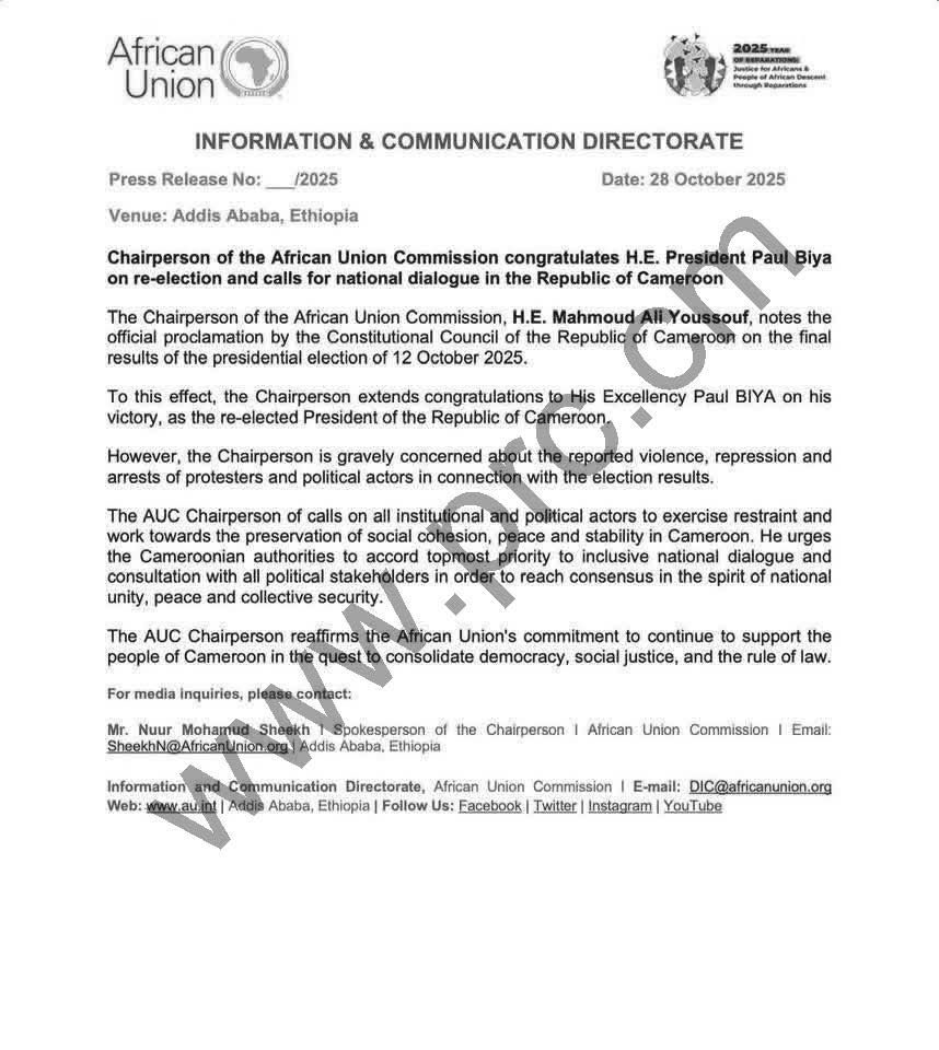 2025 Presidential Election: African Union Chairperson Sends Congratulatory Message to President Paul BIYA Print Tweet Next >