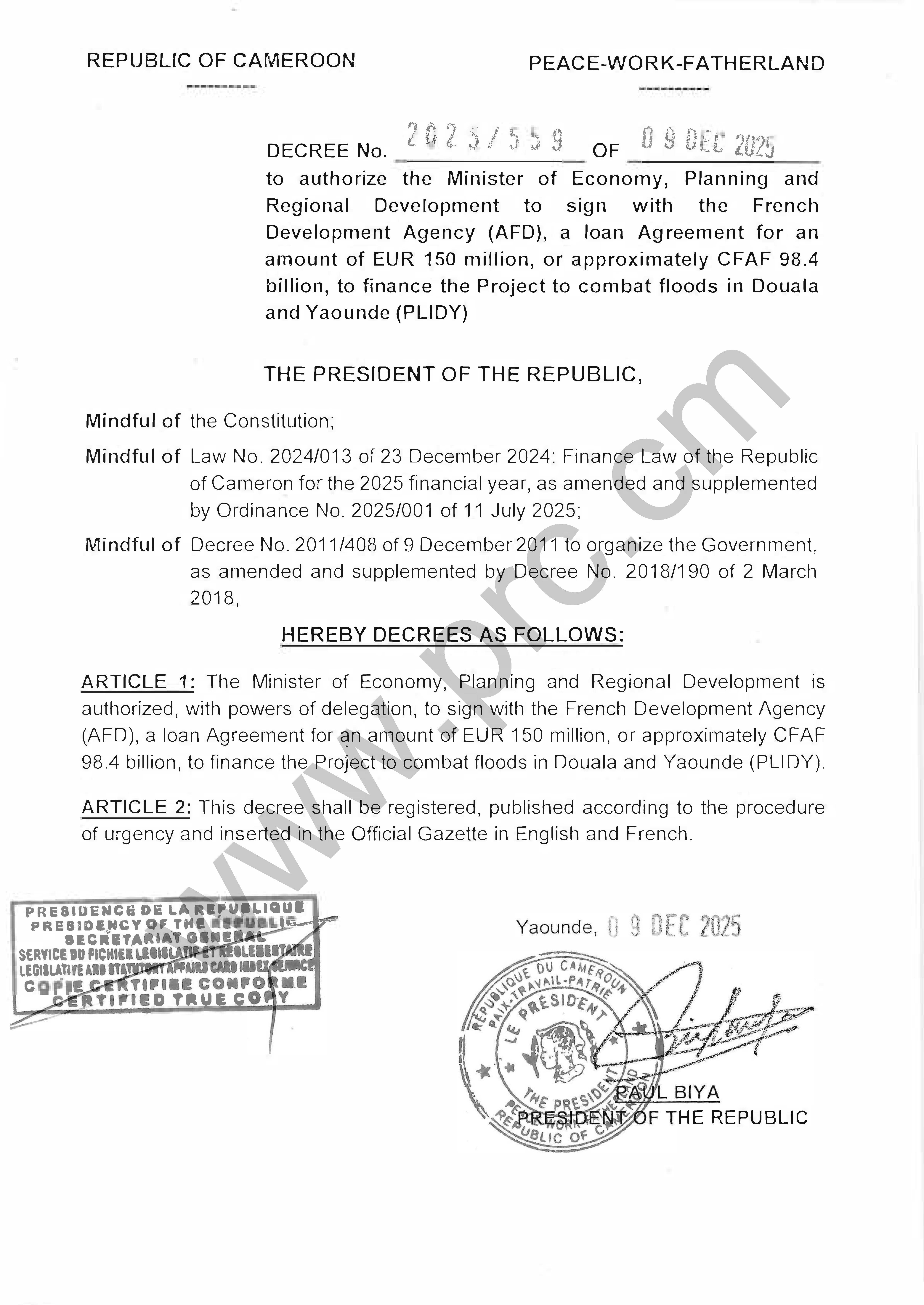 Decree No.2025/559 of 09 December 2025 to authorize a loan Agreement to finance the Project to combat floods in Douala and Yaounde (PLIDY) Print Tweet Download the Decree (PDF) < Prev Next >