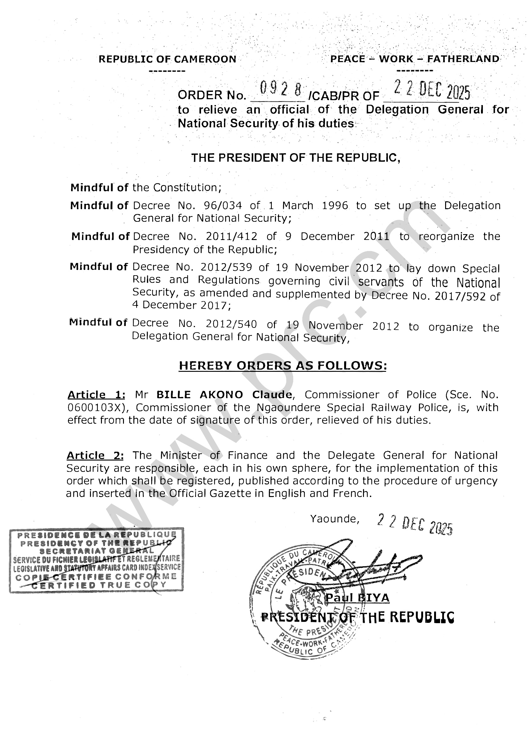 Order No.0928/CAB/PR of 22 December 2025 to relieve an official of the Delegation General for National Security Print Tweet Download (pdf) < Prev Next >