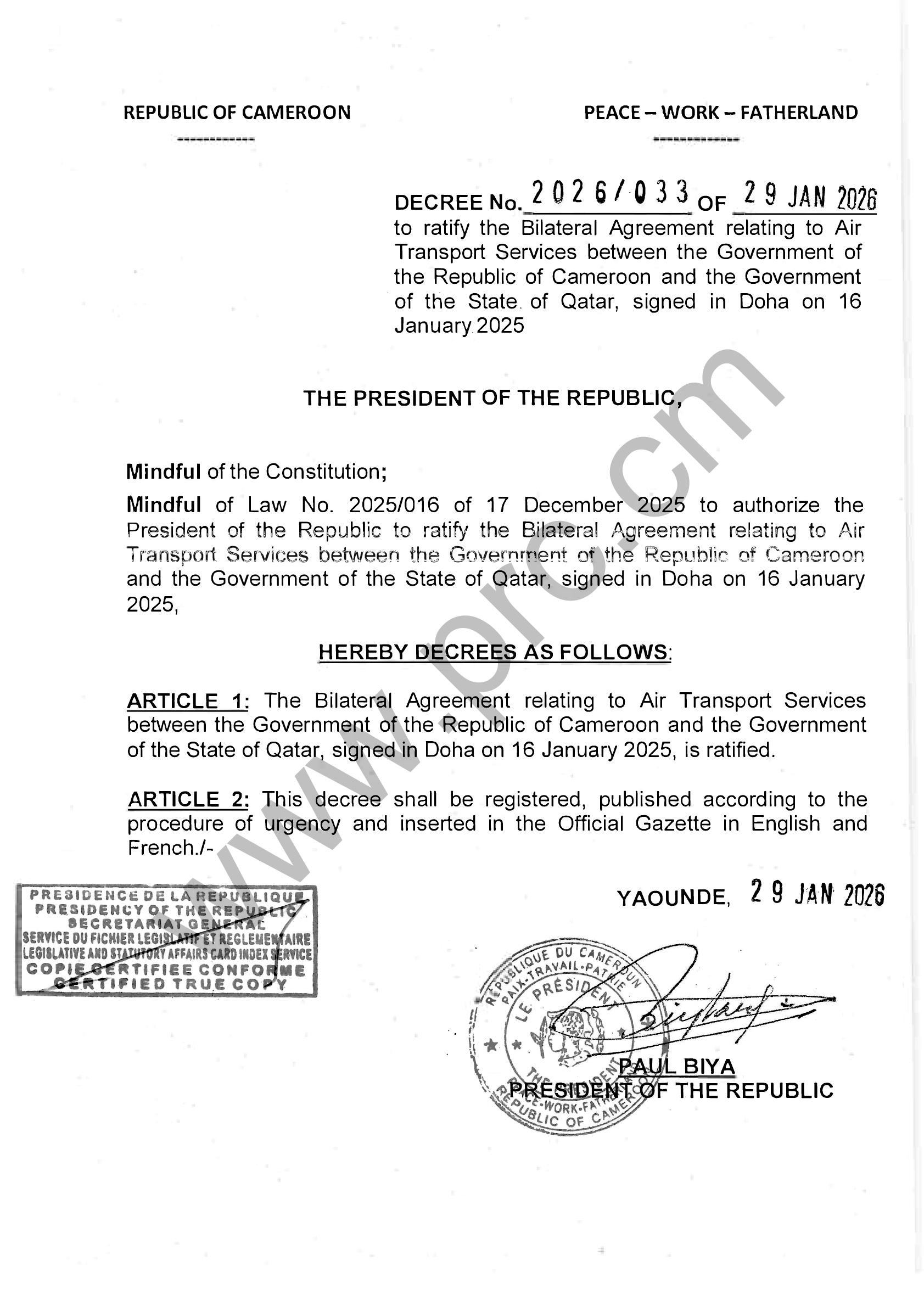 Decree No.2026/033 of 29 January 2026 to ratify the Bilateral Agreement relating to Air Transport Services between Cameroon and Qatar Print Tweet Download (pdf) Next >
