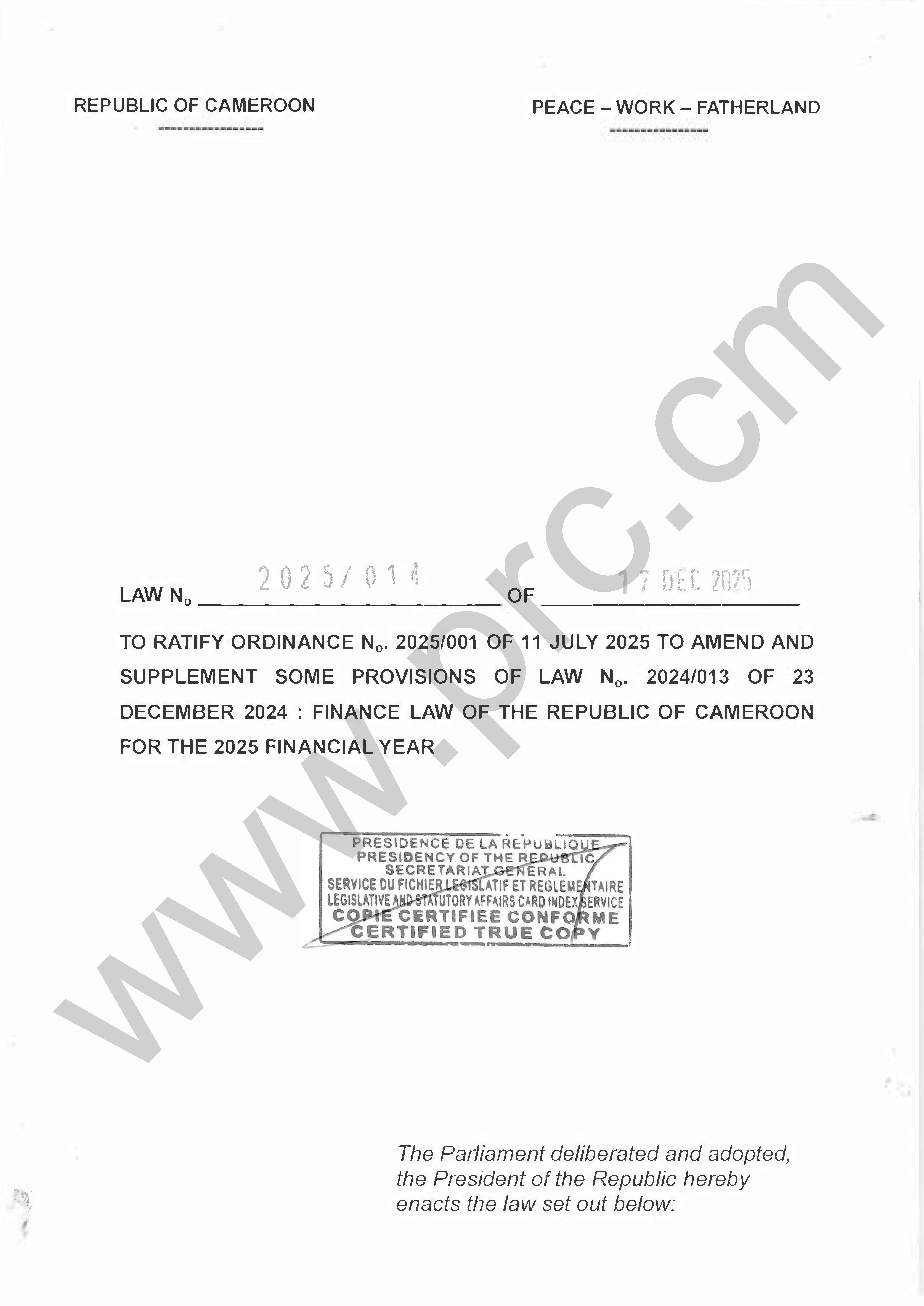 Law No.2025/014 of 17 December 2025 to ratify ordinance no.2025/001 of 11 July 2025 to amend and supplement some provisions of the 2025 finance law Print Tweet Download the Law (PDF) < Prev Next >