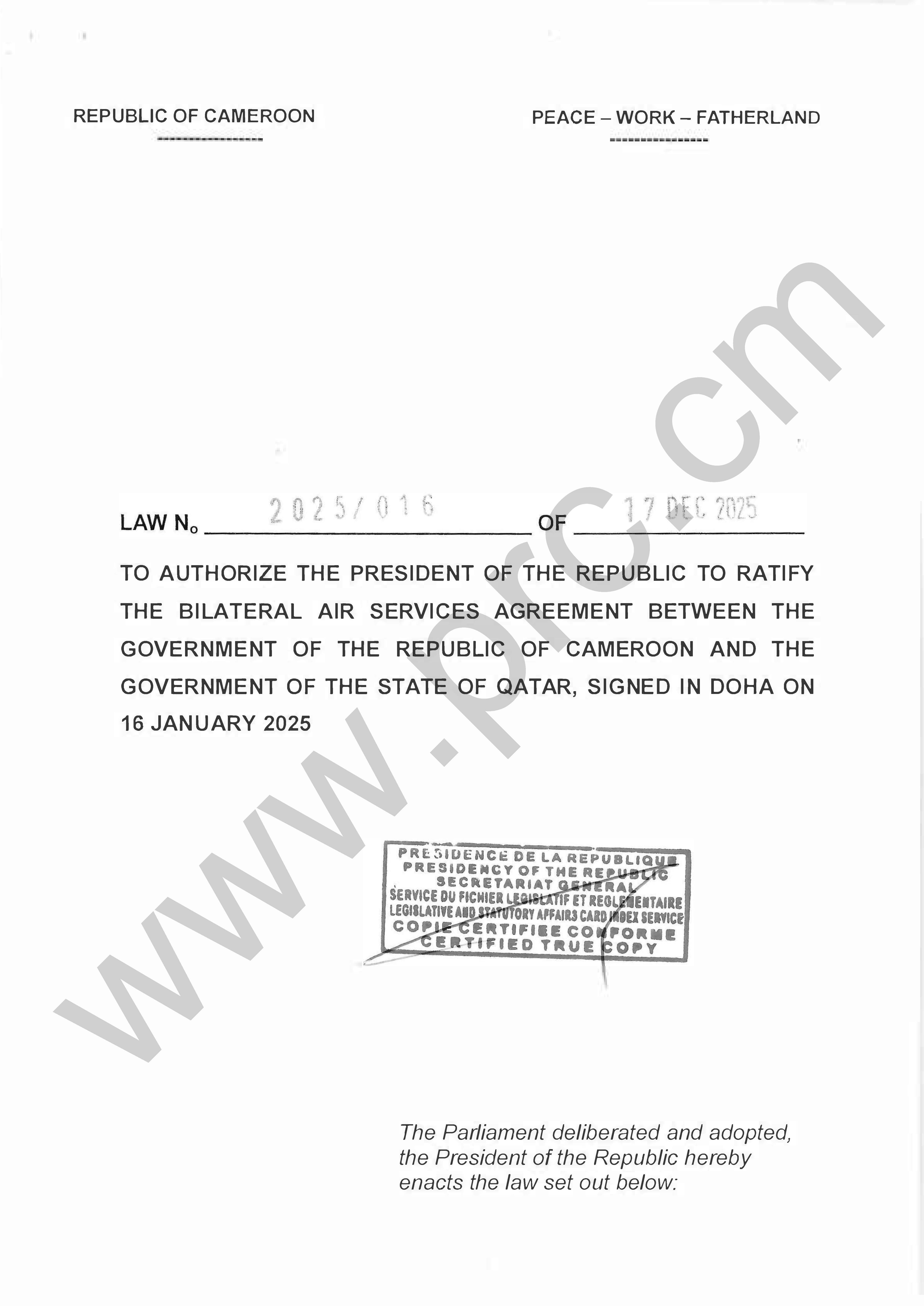 Law No.2025/016 of 17 December 2025 to authorize the President of the Republic to ratify the bilateral air services agreement between Cameroon and Qatar Print Tweet Download the Law (PDF) < Prev Next >