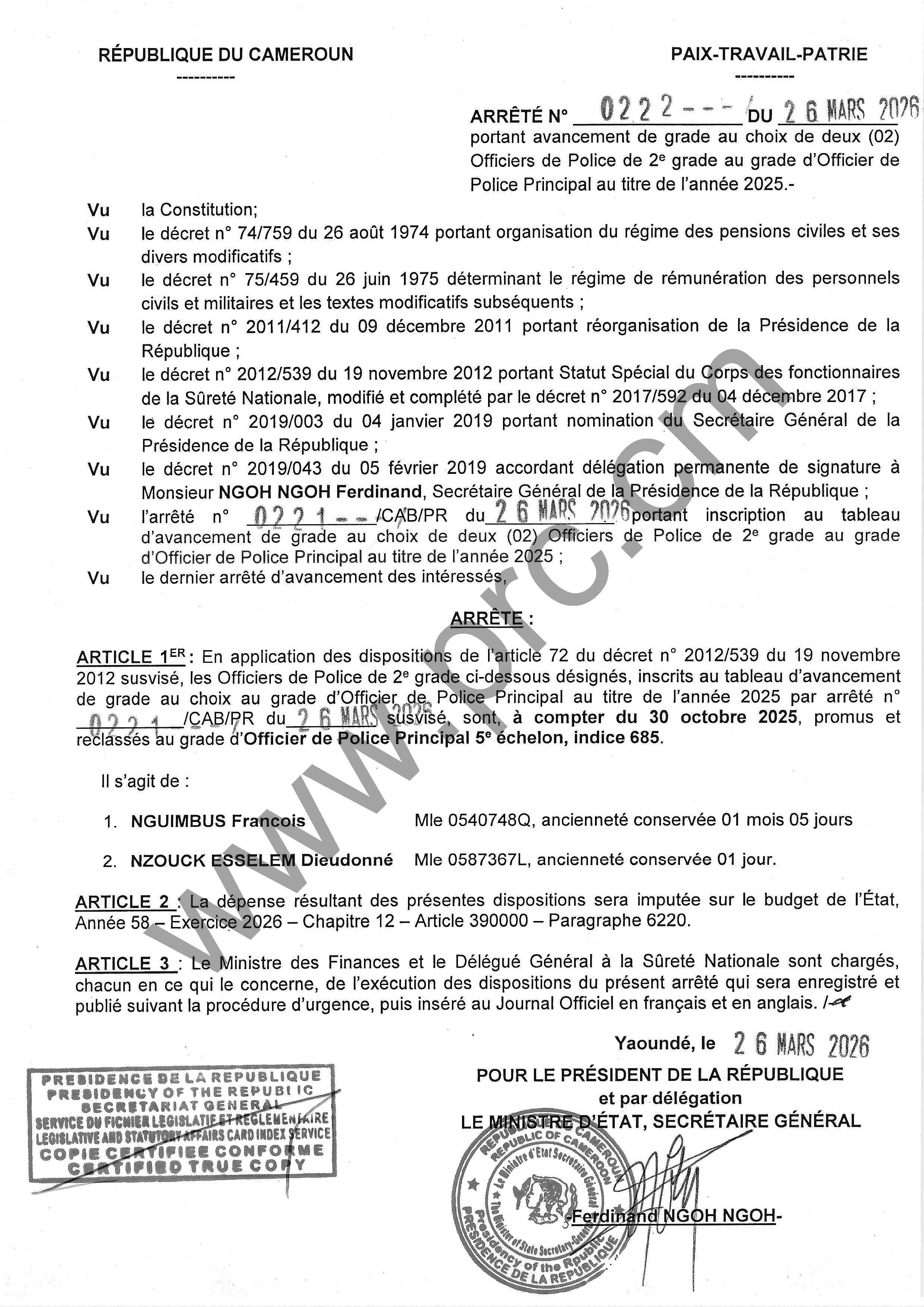 Arrêté N°0222 du 26 mars 2026 portant avancement de grade au choix de deux (02) Officiers de Police de 2e grade au grade d'Officier de Police Principal au titre de l'année 2025 Imprimer Tweet Télécharger l'arrêté (PDF) < Précédent Suivant >