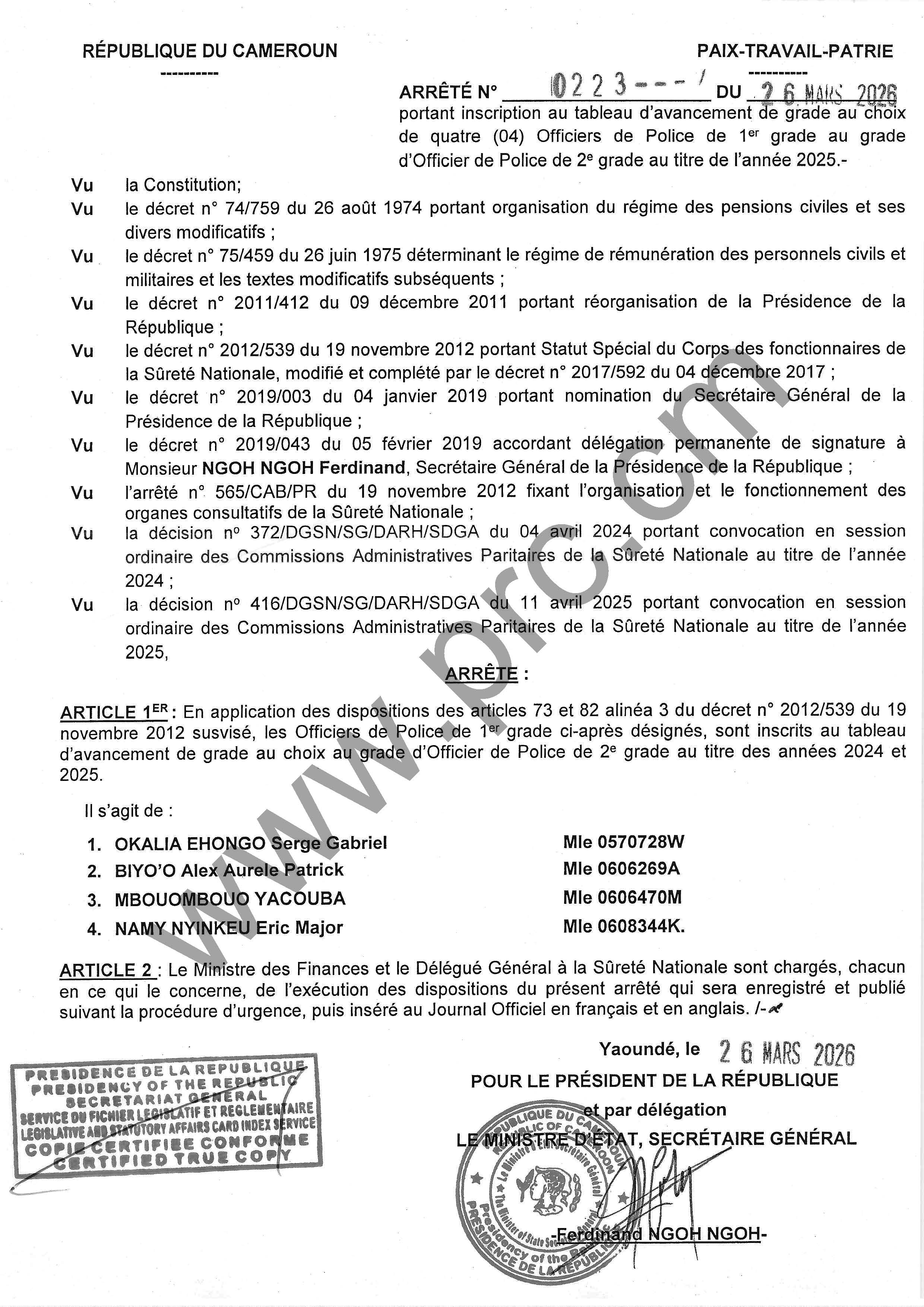 Arrêté N°0223 du 26 mars 2026 portant inscription au tableau d'avancement de grade au choix de quatre (04) Officiers de Police de 1er grade au grade d'Officier de Police de 2e grade au titre de l'année 2025 Imprimer Tweet Télécharger l'arrêté (PDF) < Précédent Suivant >