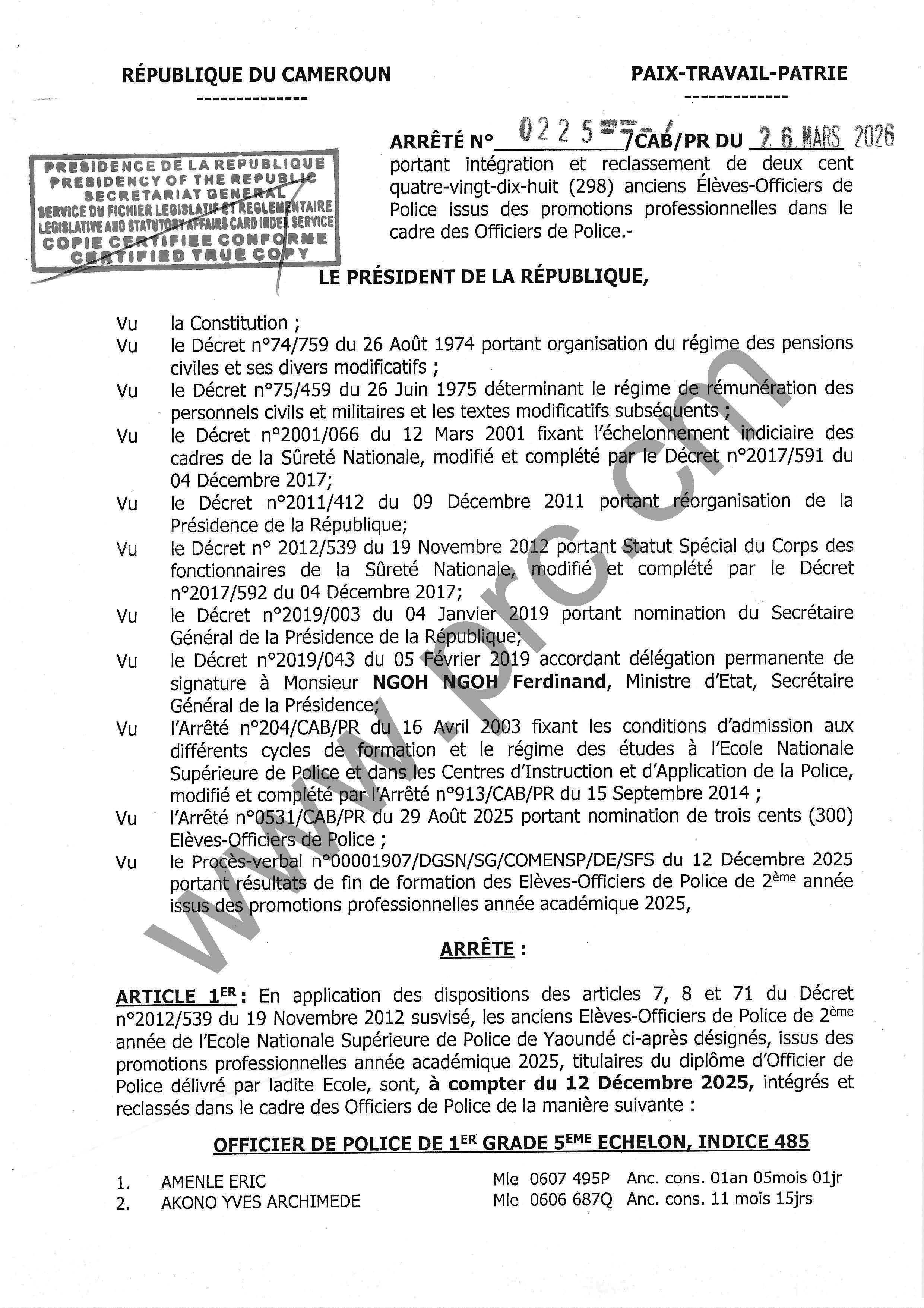 Arrêté N°0225 du 26 mars 2026 portant intégration et reclassement de deux cent quatre-vingt-dix-huit (298) anciens Élèves-Officiers de Police issus des promotions professionnelles dans le cadre des Officiers de Police Imprimer Tweet Télécharger l'arrêté (PDF) < Précédent Suivant >