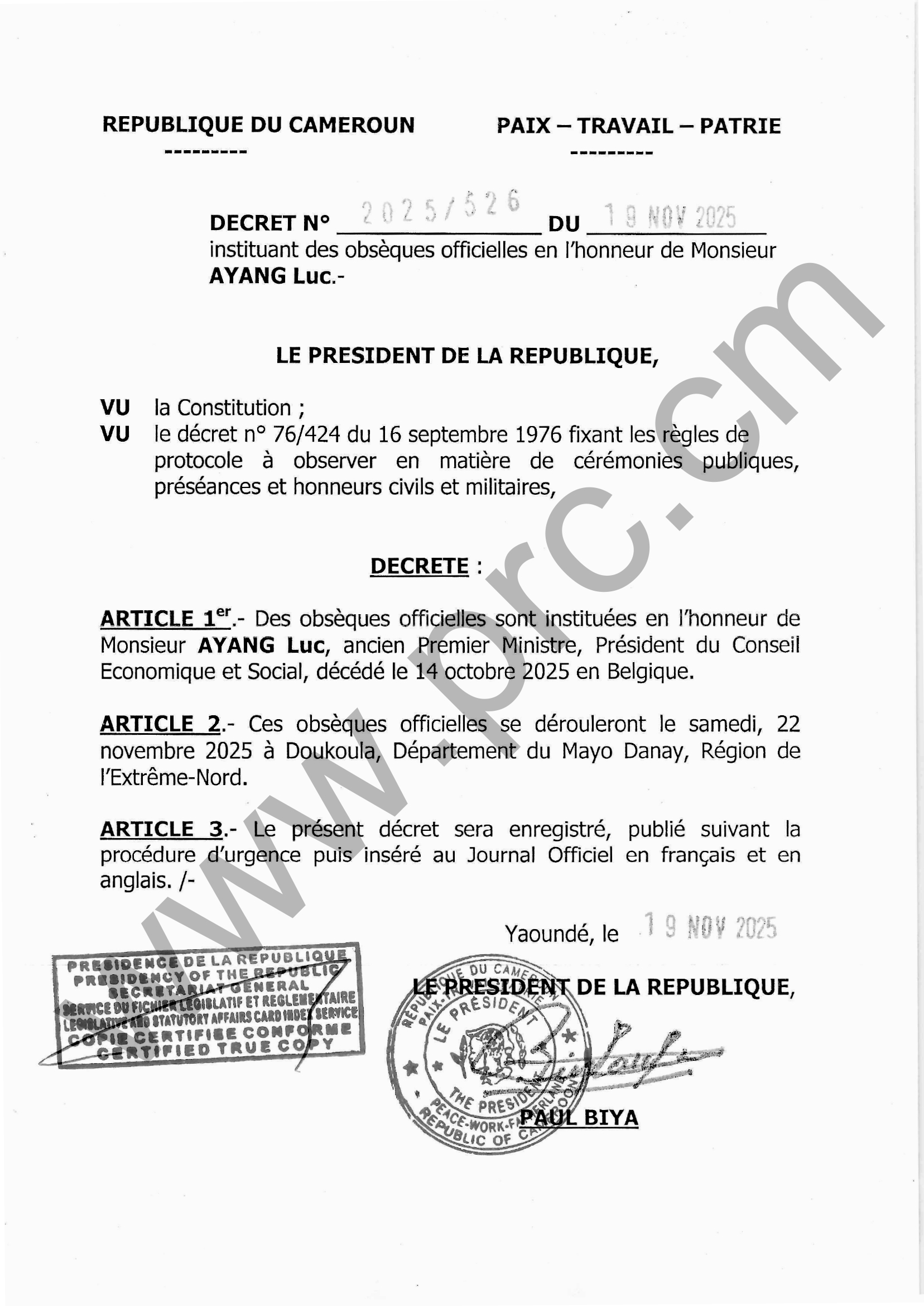 Décret N°2025/526 du 19 novembre 2025 instituant des obsèques officielles en l'honneur de Monsieur AYANG Luc Imprimer Tweet Télécharger (pdf) Suivant >