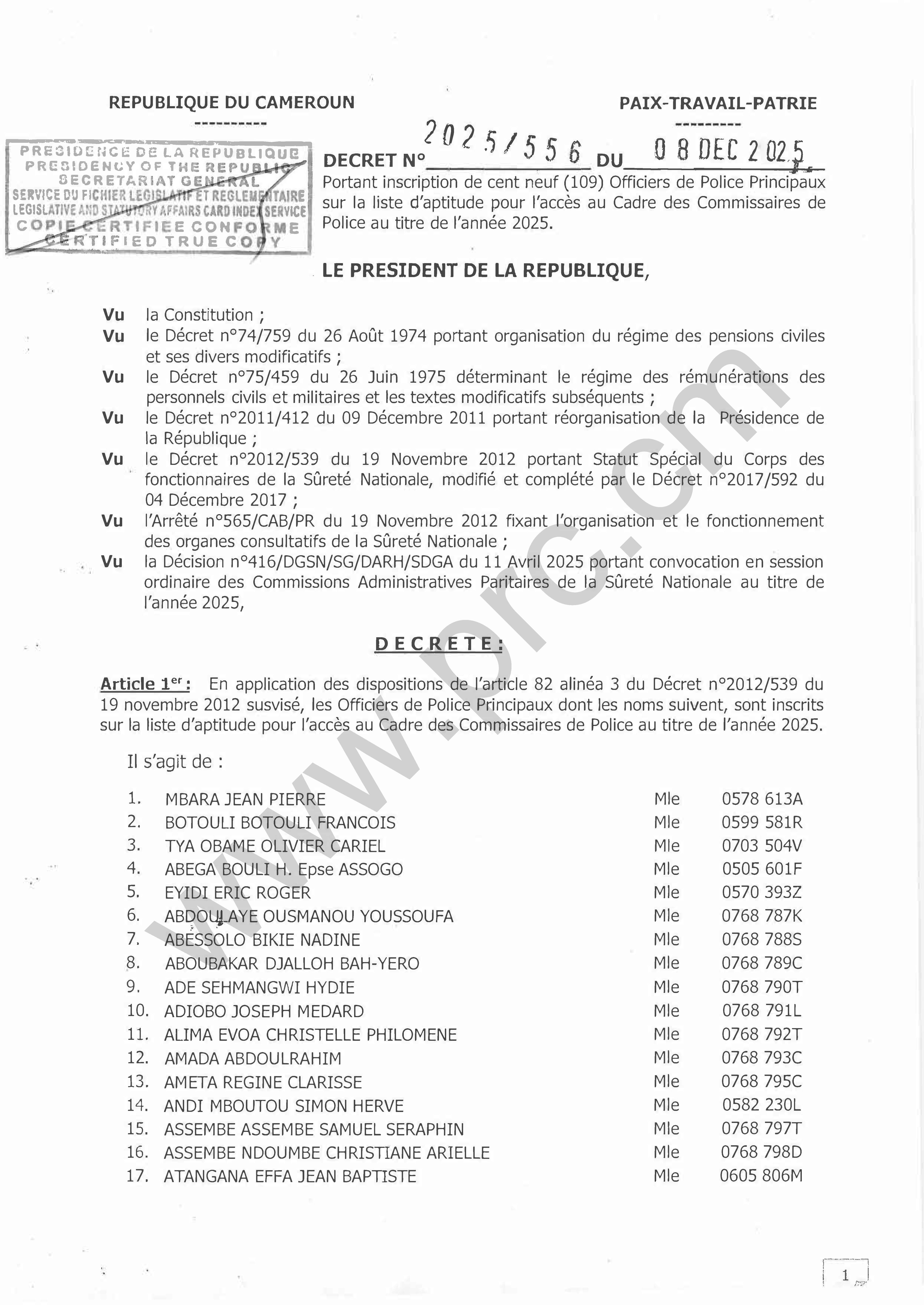 Décret N°2025/556 du 08 décembre 2025 portant inscription de cent neuf (109) Officiers de Police Principaux sur la liste d'aptitude pour l'accès au Cadre des Commissaires de Police au titre de l'année 2025 Imprimer Tweet Télécharger l'intégralité du texte (pdf) < Précédent Suivant >