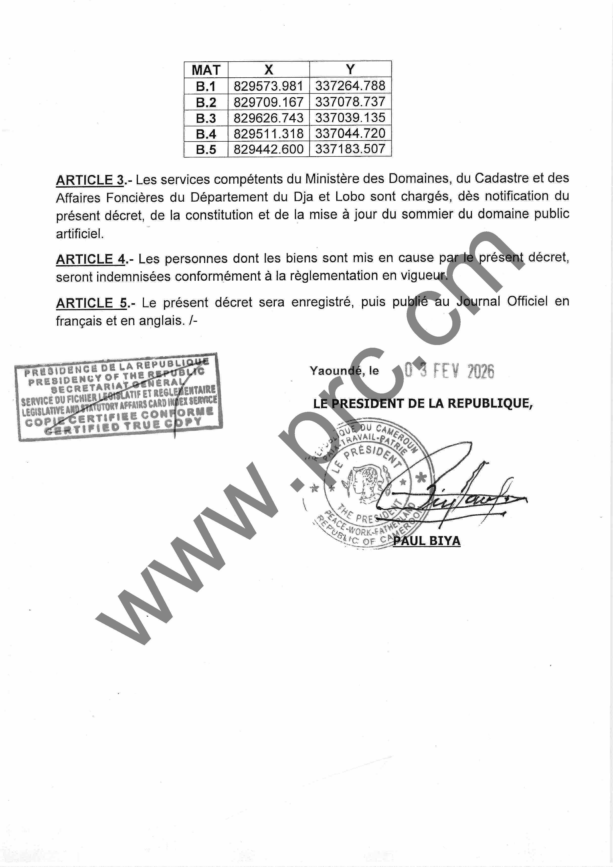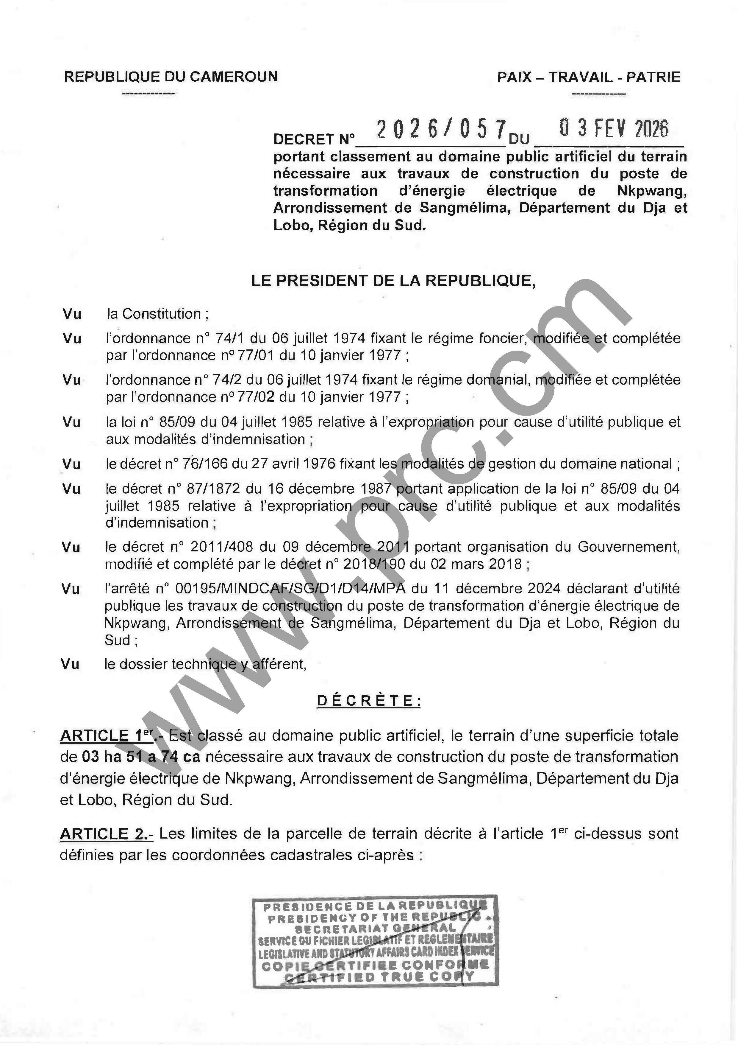 Décret N°2026/057 du 03 février 2026 portant classement au domaine public artificiel du terrain nécessaire aux travaux de construction du poste de transformation d'énergie électrique de Nkpwang, Region du Sud Imprimer Tweet Télécharger le décret (PDF) < Précédent Suivant >