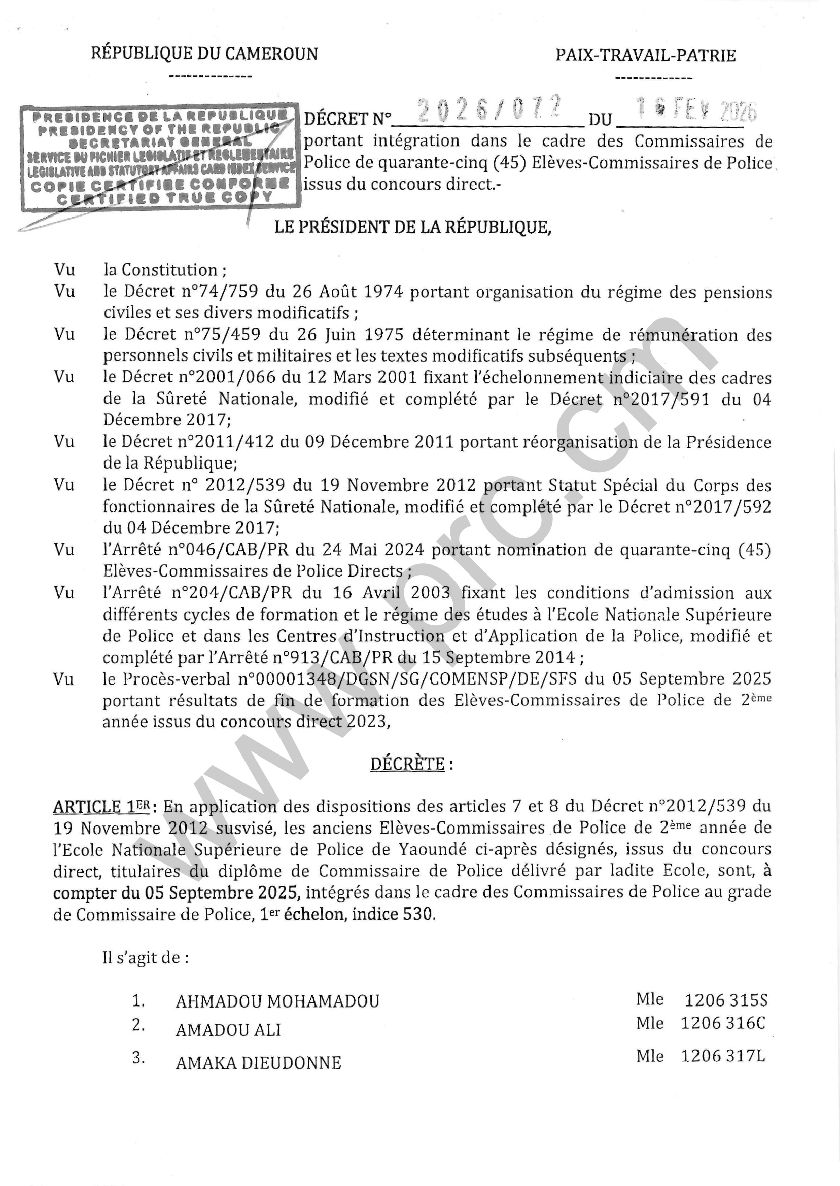 Décret N°2026/072 du 16 février 2026 portant intégration dans le cadre des Commissaires de Police de quarante-cinq (45) Elèves-Commissaires de Police issus du concours direct Imprimer Tweet Télécharger l'intégralité du texte (pdf) < Précédent Suivant >