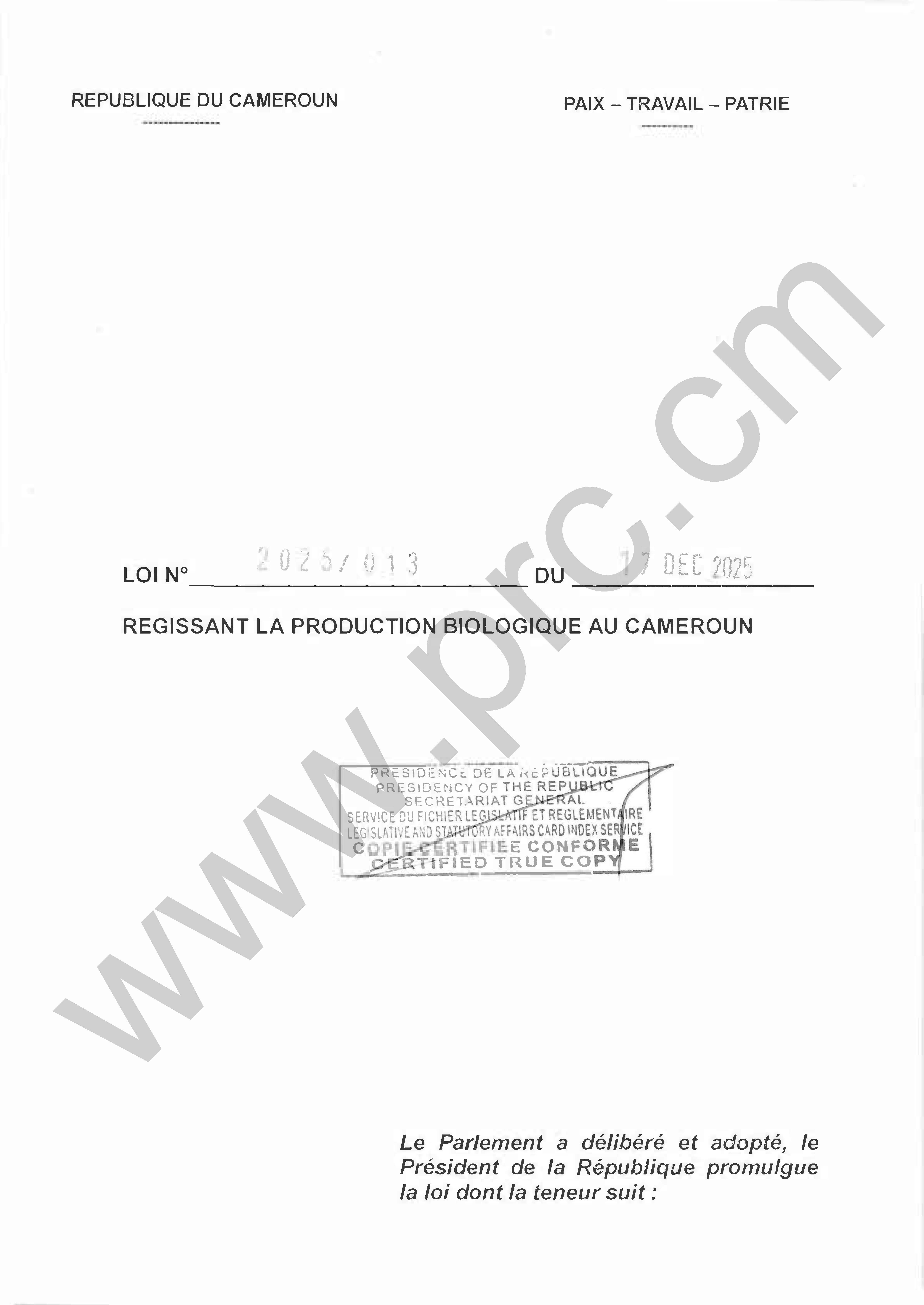 Loi N°2025/013 du 17 décembre 2025 régissant la production biologique au Cameroun Imprimer Tweet Télécharger la loi (PDF) < Précédent Suivant >