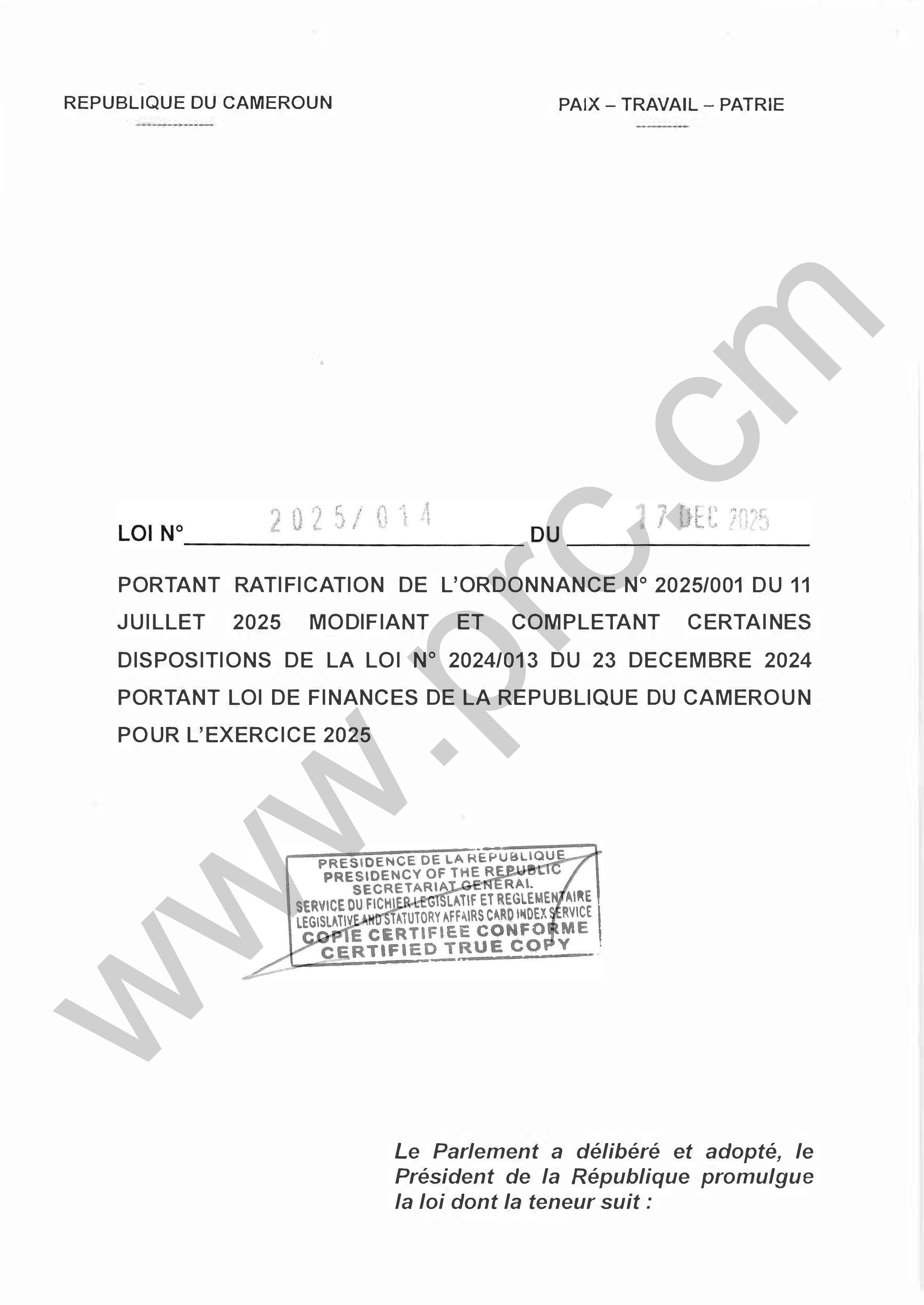 Loi N°2025/014 du 17 décembre 2025 portant ratification de l’ordonnance n°2025/001 du 11 juillet 2025 modifiant et complétant certaines dispositions de la loi n°2024/013 du 23 décembre 2024 portant loi de finances du Cameroun pour l’exercice 2025 Imprimer Tweet Télécharger la loi (PDF) < Précédent Suivant >