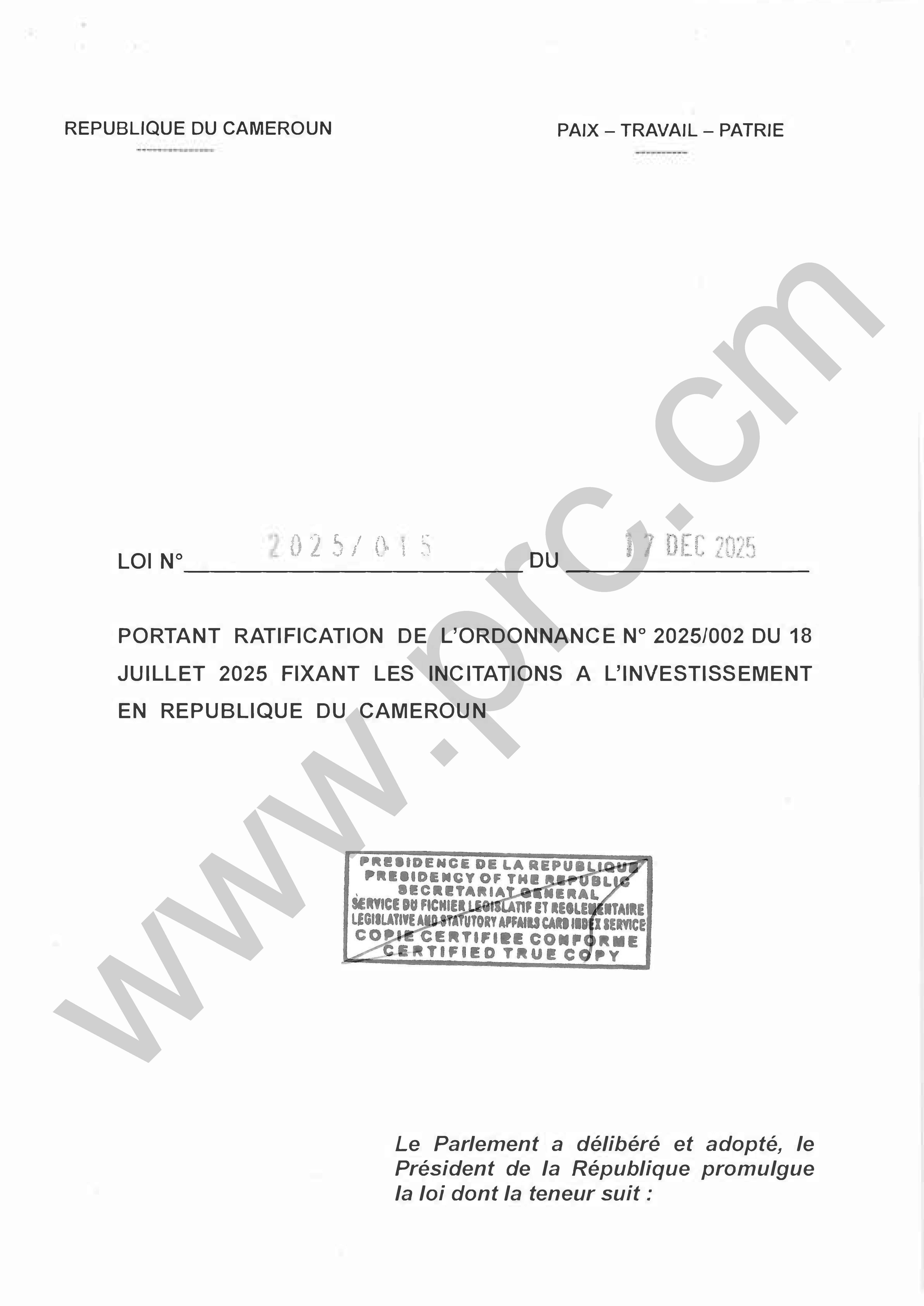 Loi N°2025/015 du 17 décembre 2025 portant ratification de l’ordonnance n°2025/002 du 18 juillet 2025 fixant les incitations à l'investissement en République du Cameroun Imprimer Tweet Télécharger la loi (PDF) < Précédent Suivant >