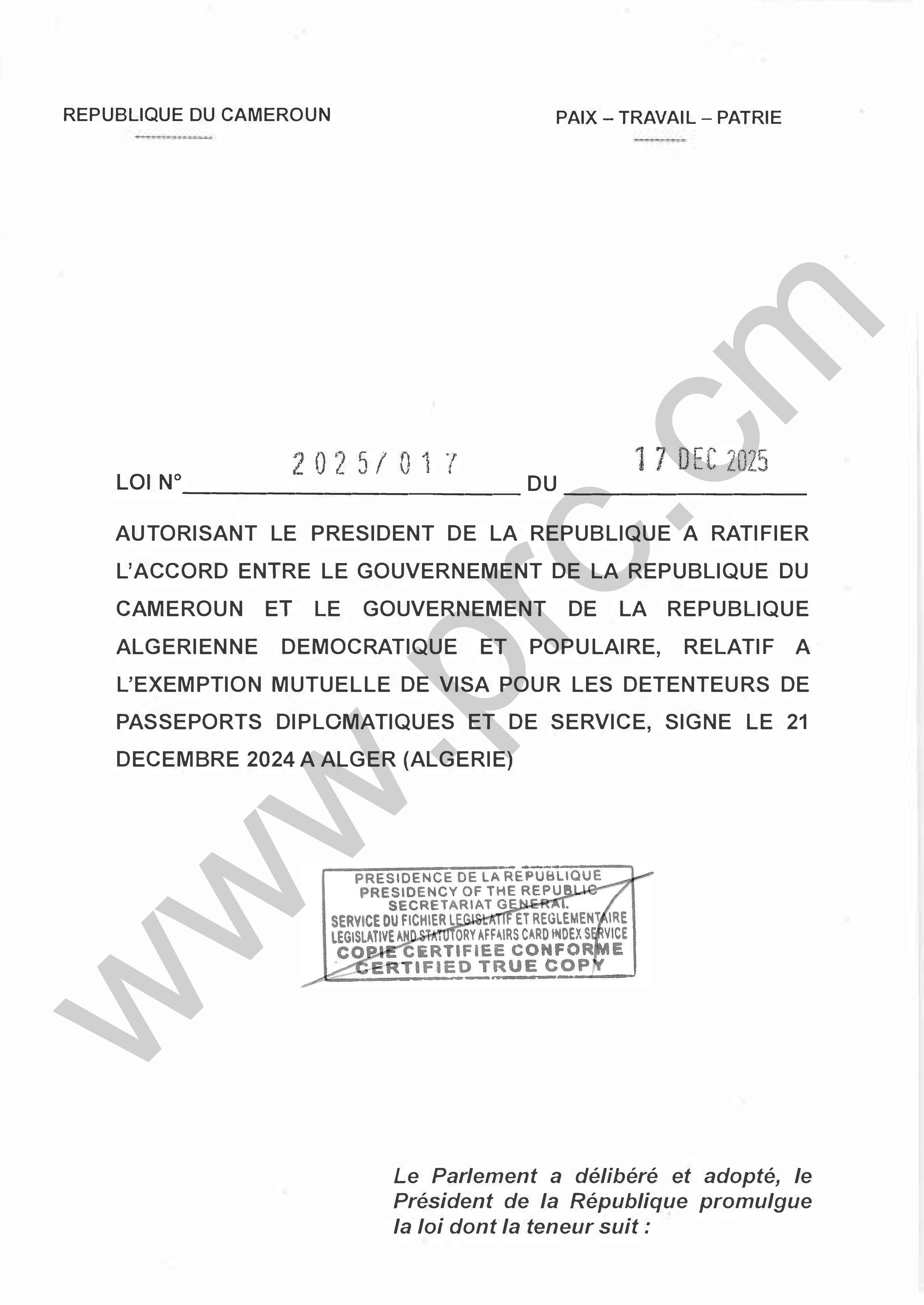 Loi N°2025/017 du 17 décembre 2025 autorisant le Président de la République à ratifier l'accord entre le Cameroun et l’Algérie, signé le 21 décembre 2024 à Alger (Algérie) Imprimer Tweet Télécharger la loi (PDF) Suivant >