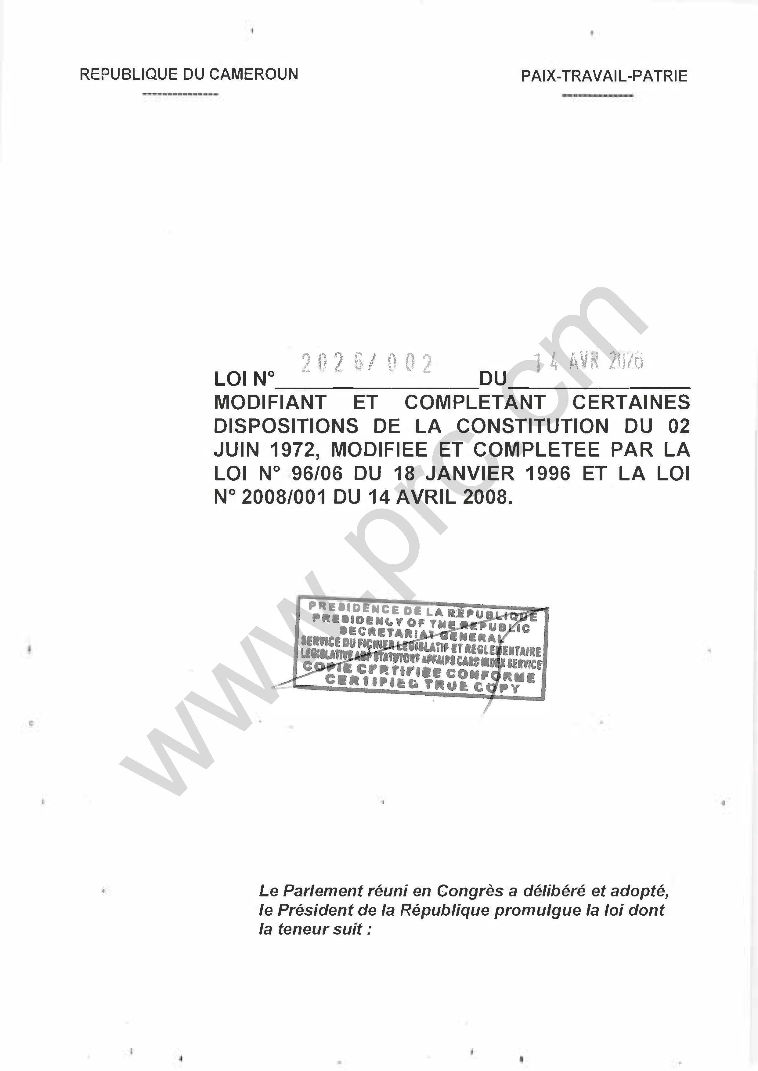 Loi N°2026/002 du 14 avril 2026 modifiant et complétant certaines dispositions de la Constitution du 02 juin 1972, modifiée et complétée par la loi N°96/06 du 18 janvier 1996 et la loi N°2008/001 du 14 avril 2008 Imprimer Tweet Télécharger la loi (PDF) < Précédent Suivant >