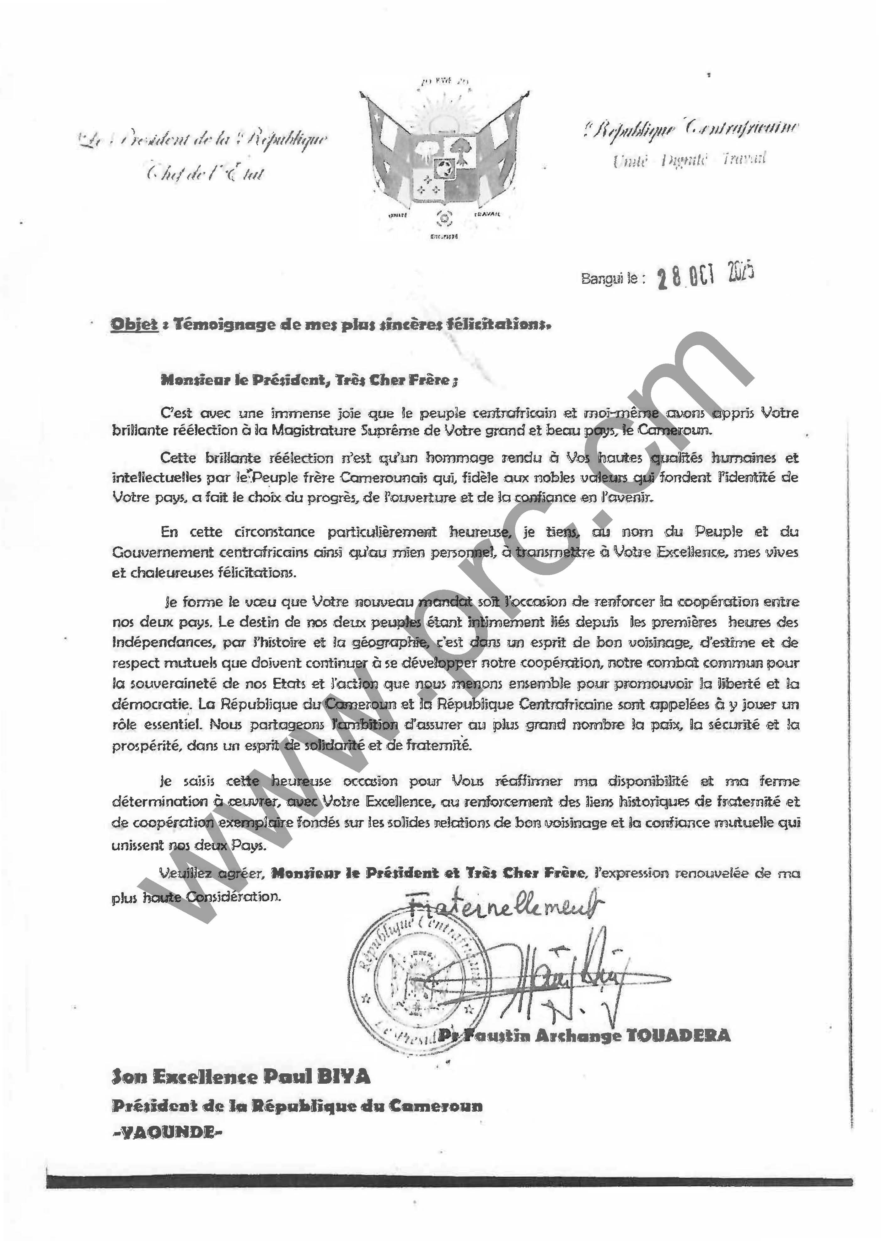 Félicitations de SE Pr Faustin-Archange Touadéra Président de la République Centrafricaine à SE Paul Biya, suite à sa réélection à la Magistrature Suprême du Cameroun, le 27 octobre 2025 Imprimer Tweet < Précédent Suivant >