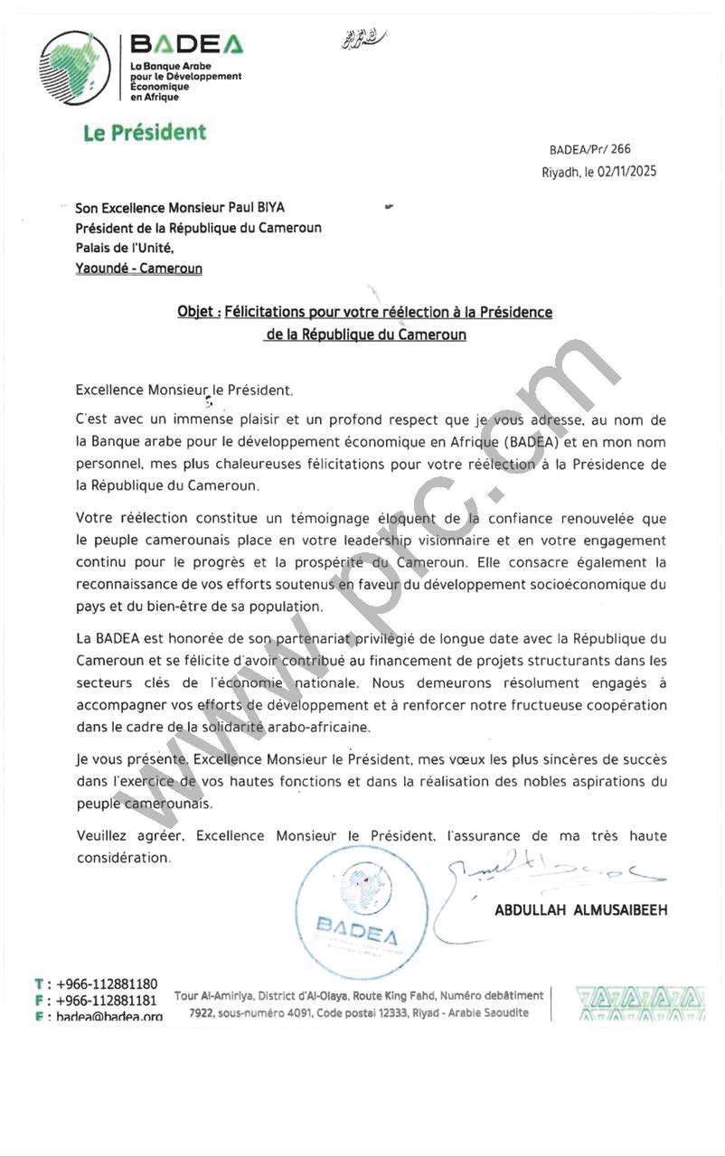 Félicitations de M. Abdullah Almusaibeeh, Président de la Banque Arabe pour le Développement Economique en Afrique à SE Paul Biya, suite à sa réélection à la Magistrature Suprême du Cameroun, le 27 octobre 2025 Imprimer Tweet < Précédent Suivant >