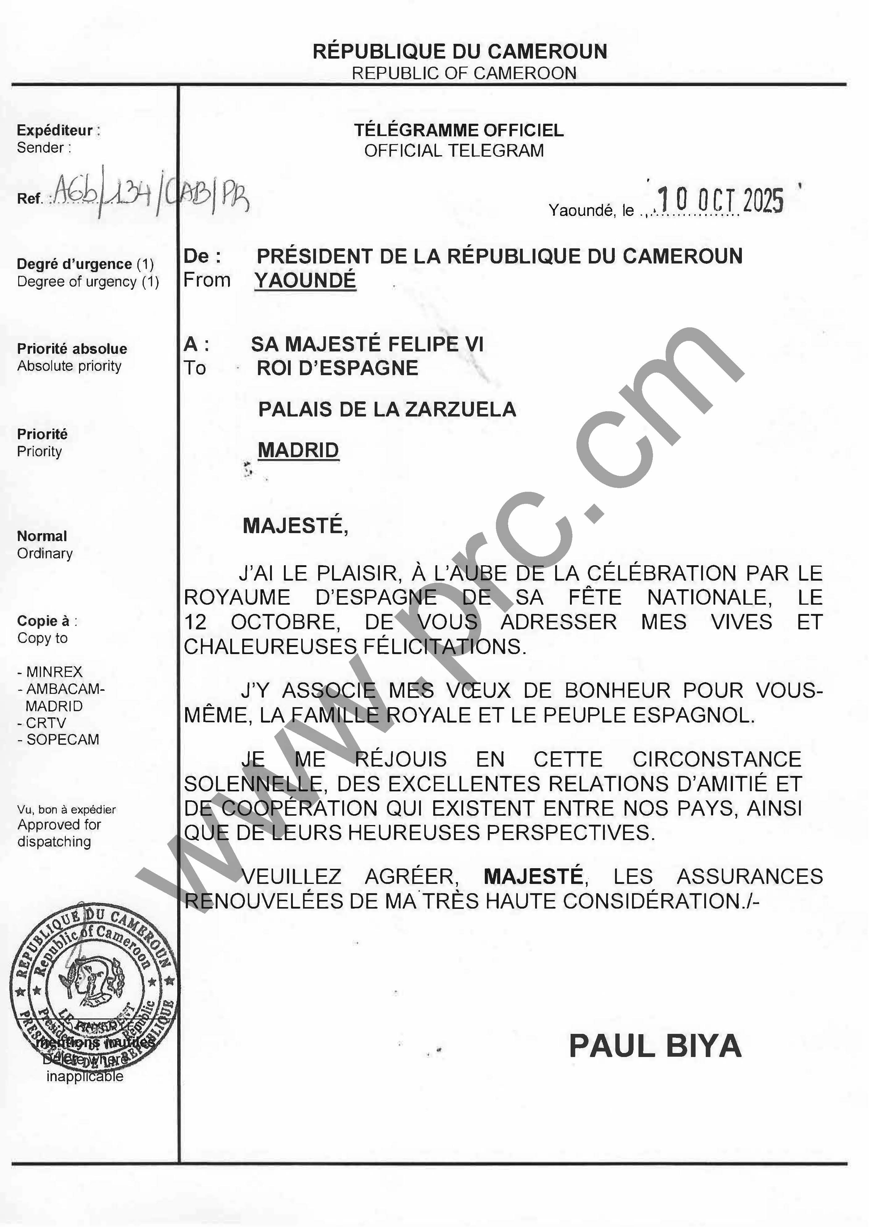 Message de félicitations du Chef de l’Etat à Sa Majesté Felipe VI, à l'occasion de la fête nationale du Royaume d’Espagne, le 12 octobre 2025 Imprimer Tweet Suivant >