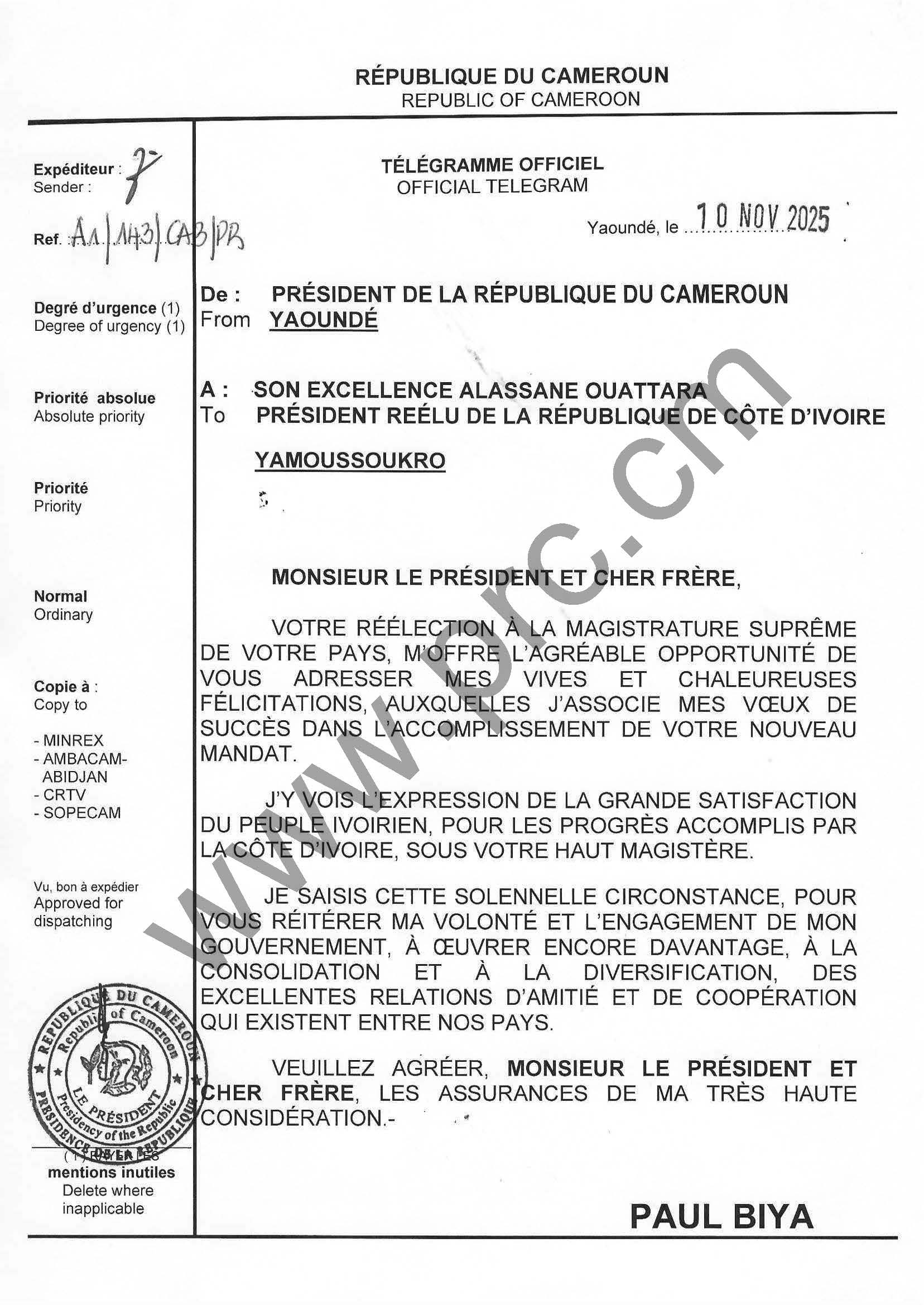 Message de félicitations du Chef de l’Etat à SE Alassane Ouattara, Président réélu de la République de Côte d’Ivoire Imprimer Tweet Suivant >