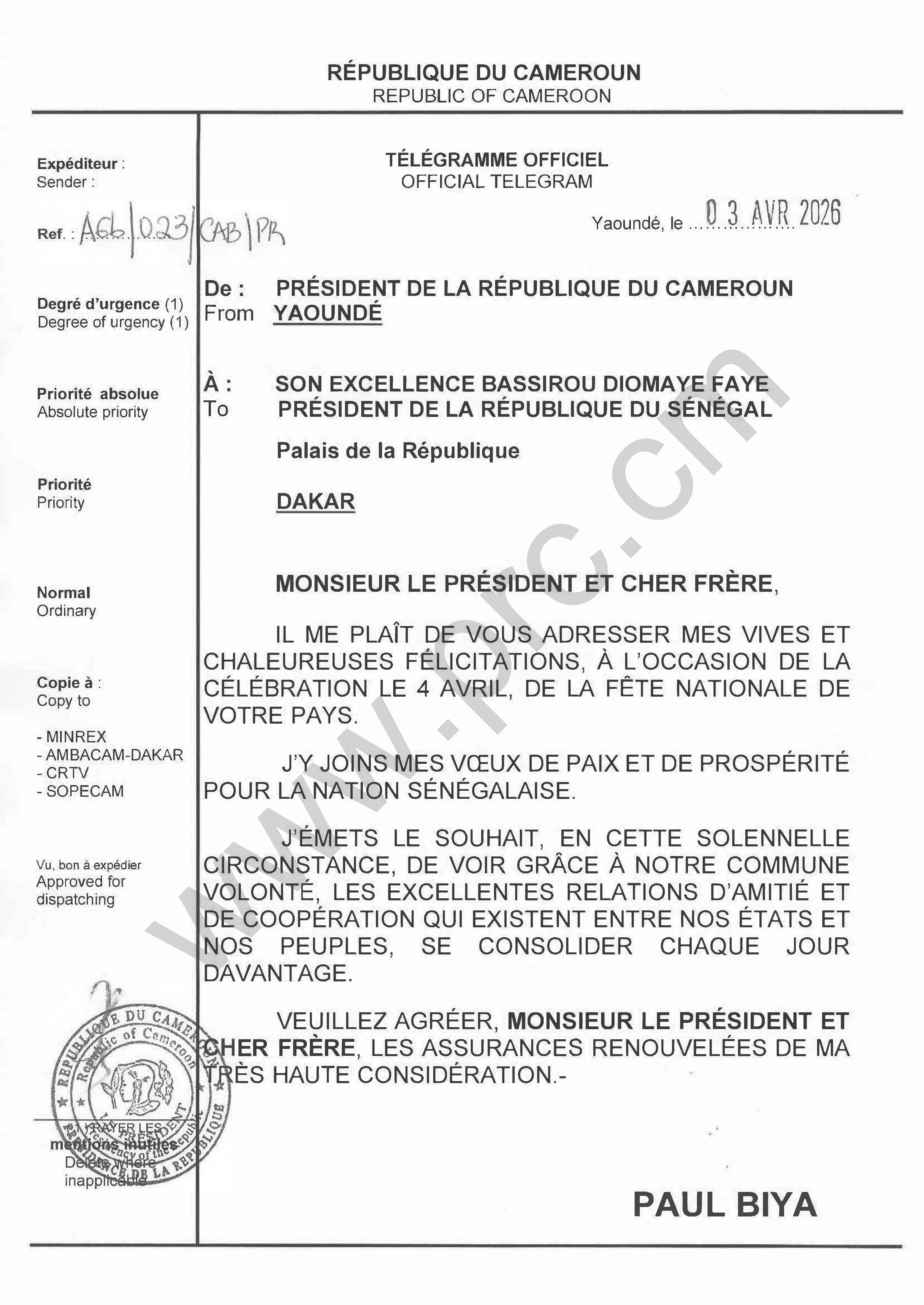 Message de félicitations du Président Paul Biya à Son Excellence Bassirou Diomaye Faye, à l’occasion de la célébration de la fête nationale de la République du Sénégal, le 04 avril 2026 Imprimer Tweet Suivant >