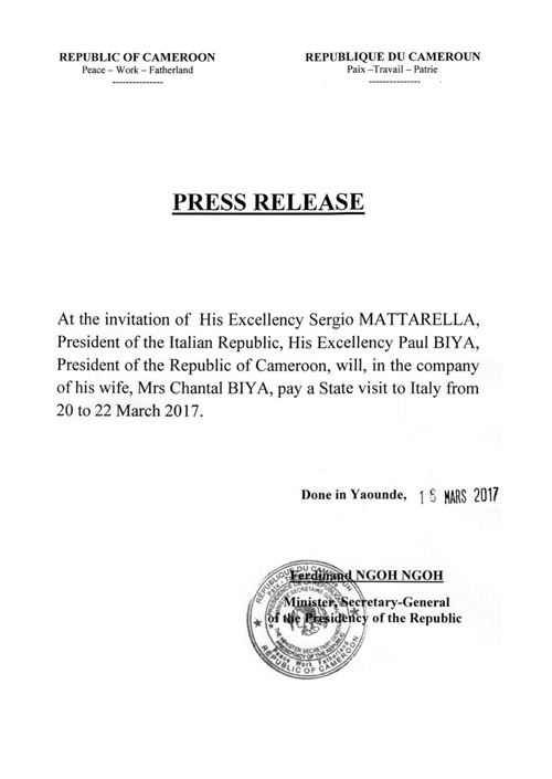 Press release - State Visit of H.E. Paul BIYA to Italy