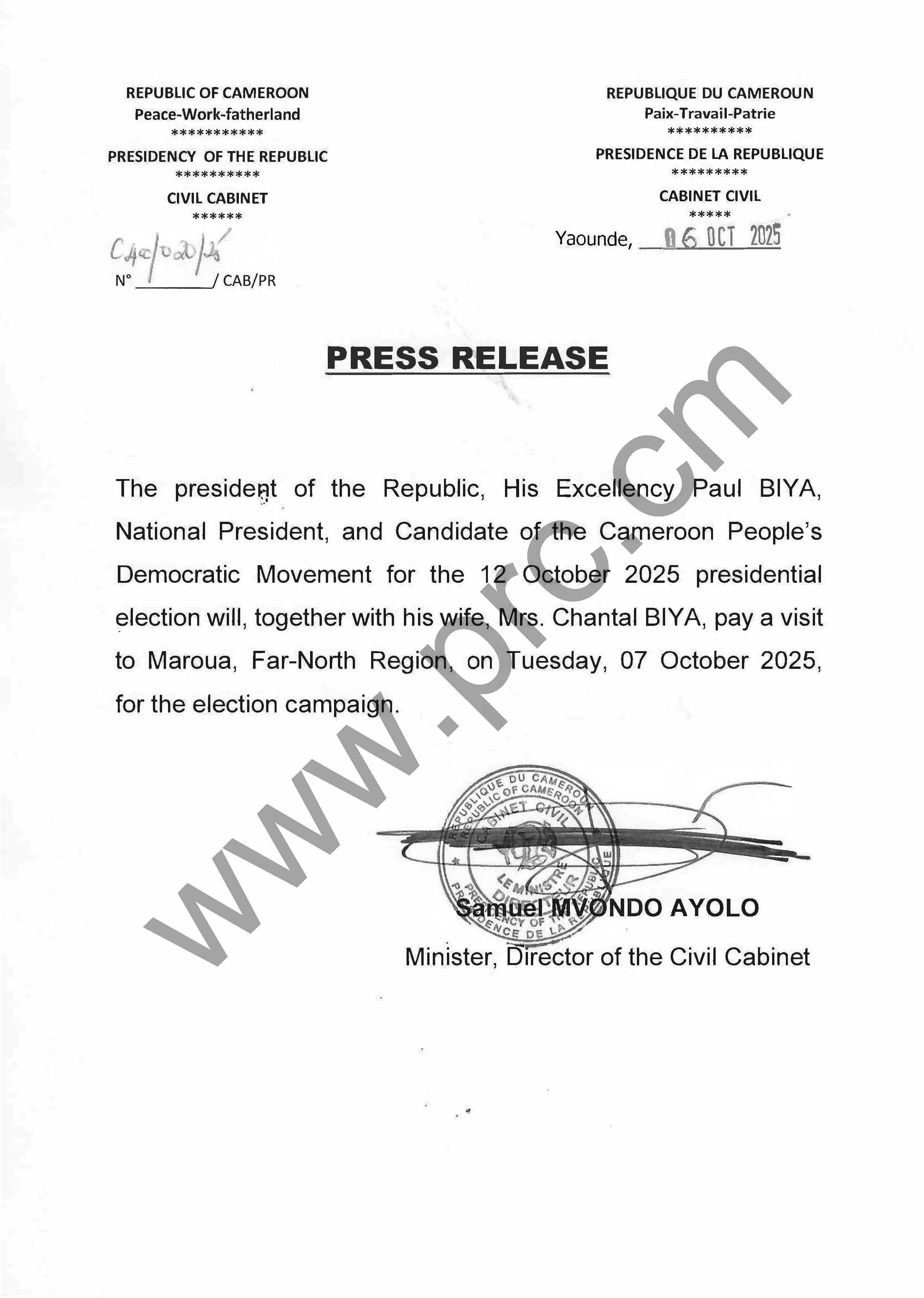 Press Release on President Candidate Paul BIYA's Visit to Maroua