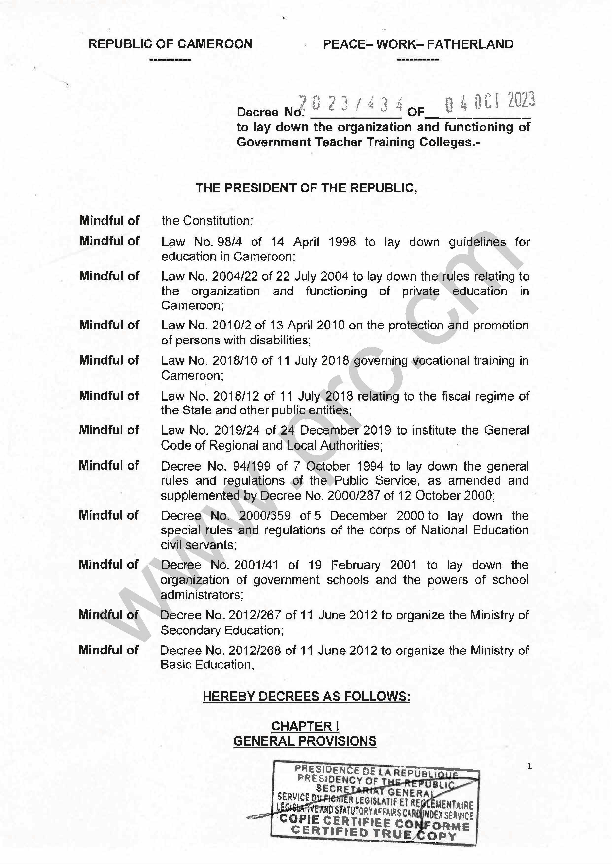 Decree No. 2023/434 of 4 October 2023 to lay down the organization and functioning of Government Teacher Training Collages Print Tweet Download the Decree (PDF) < Prev Next >