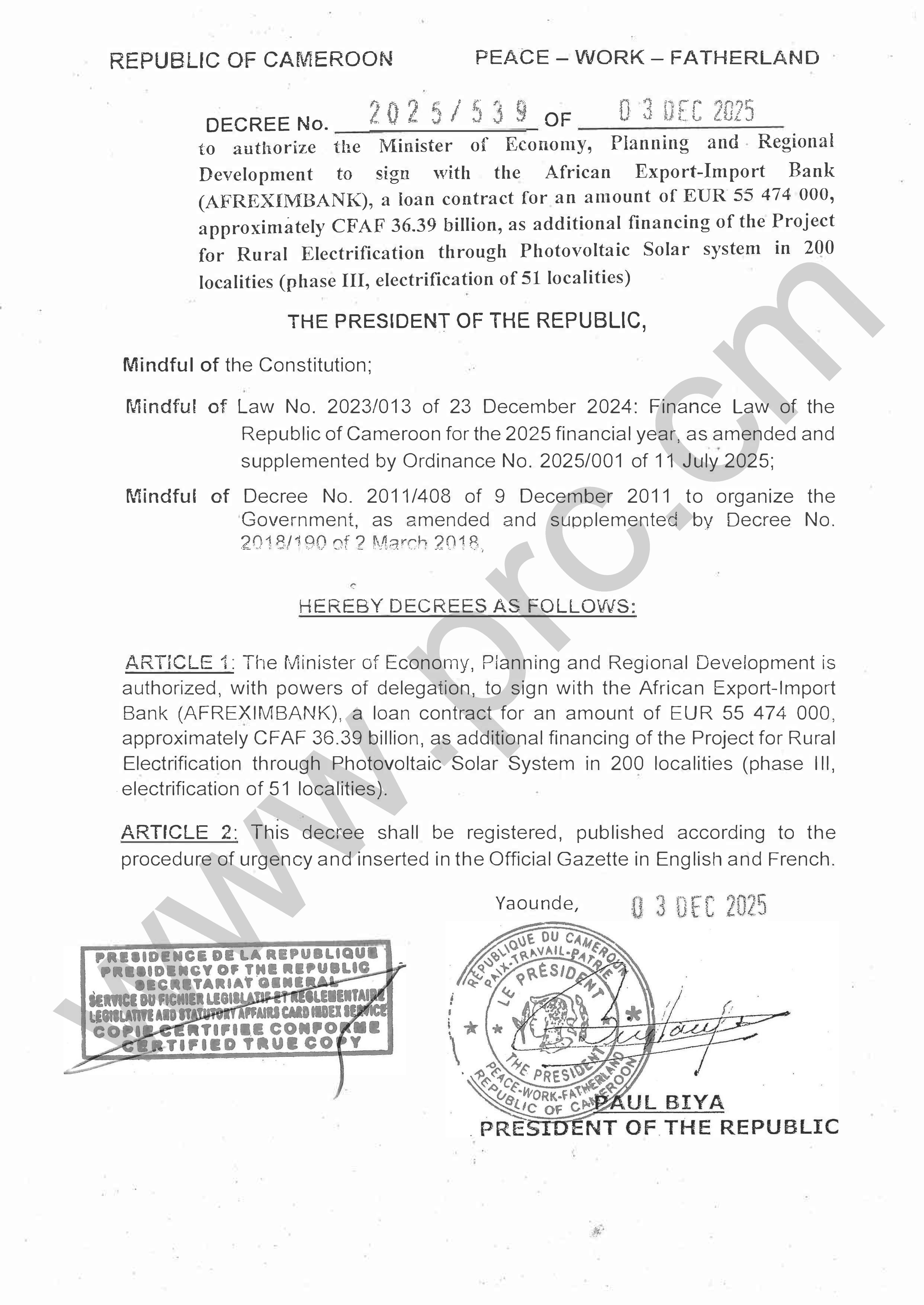 Decree No.2025/539 of 03 December 2025 to authorize a loan contract to finance the Project for Rural Electrification through Photovoltaic Solar system in 200 localities Print Tweet Download (pdf) Next >