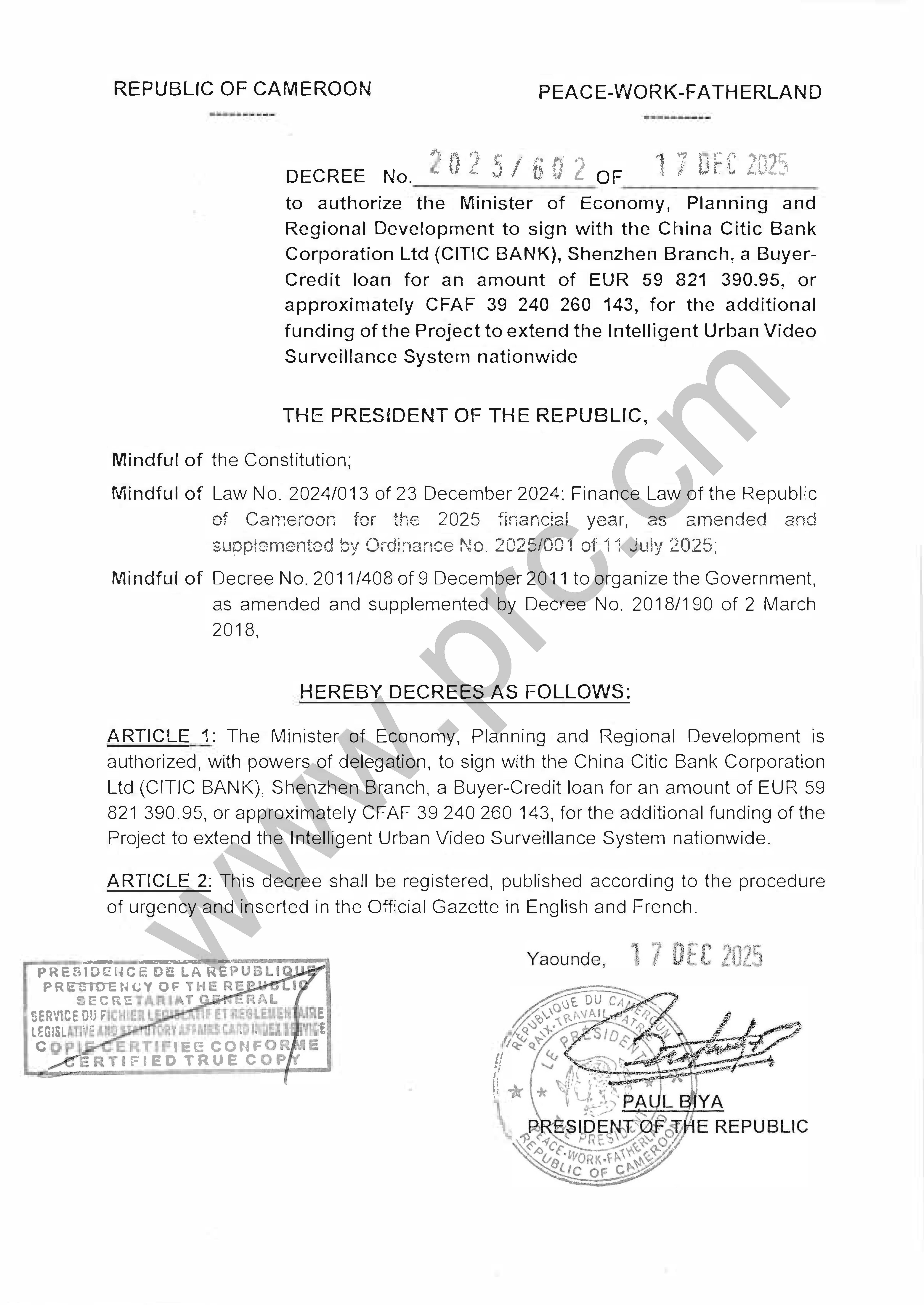 Decree No.2025/602 of 17 December 2025 to authorize a Buyer-Credit loan to finance the Project to extend the Intelligent Urban Video Surveillance System nationwide Print Tweet Download the Decree (PDF) Next >