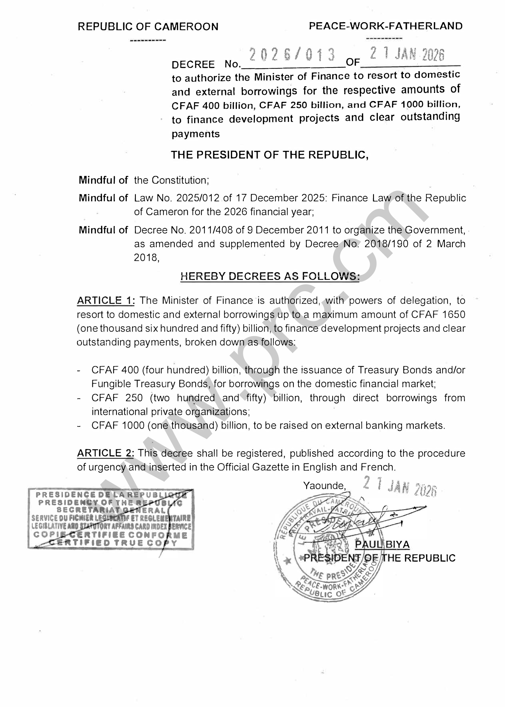 Decree No.2026/013 of 21 January 2026 to authorize domestic and external borrowings to finance development projects and clear outstanding payments Print Tweet Download (pdf) Next >