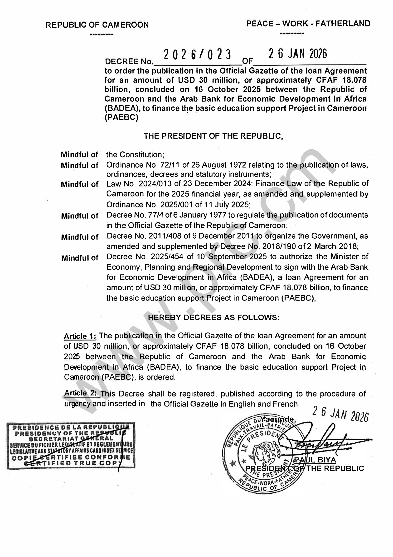 Decree No.2026/023 of 26 January 2026 to order the publication in the Official Gazette of the loan Agreement to finance the basic education support Project in Cameroon (PAEBC) Print Tweet Download (pdf) < Prev Next >
