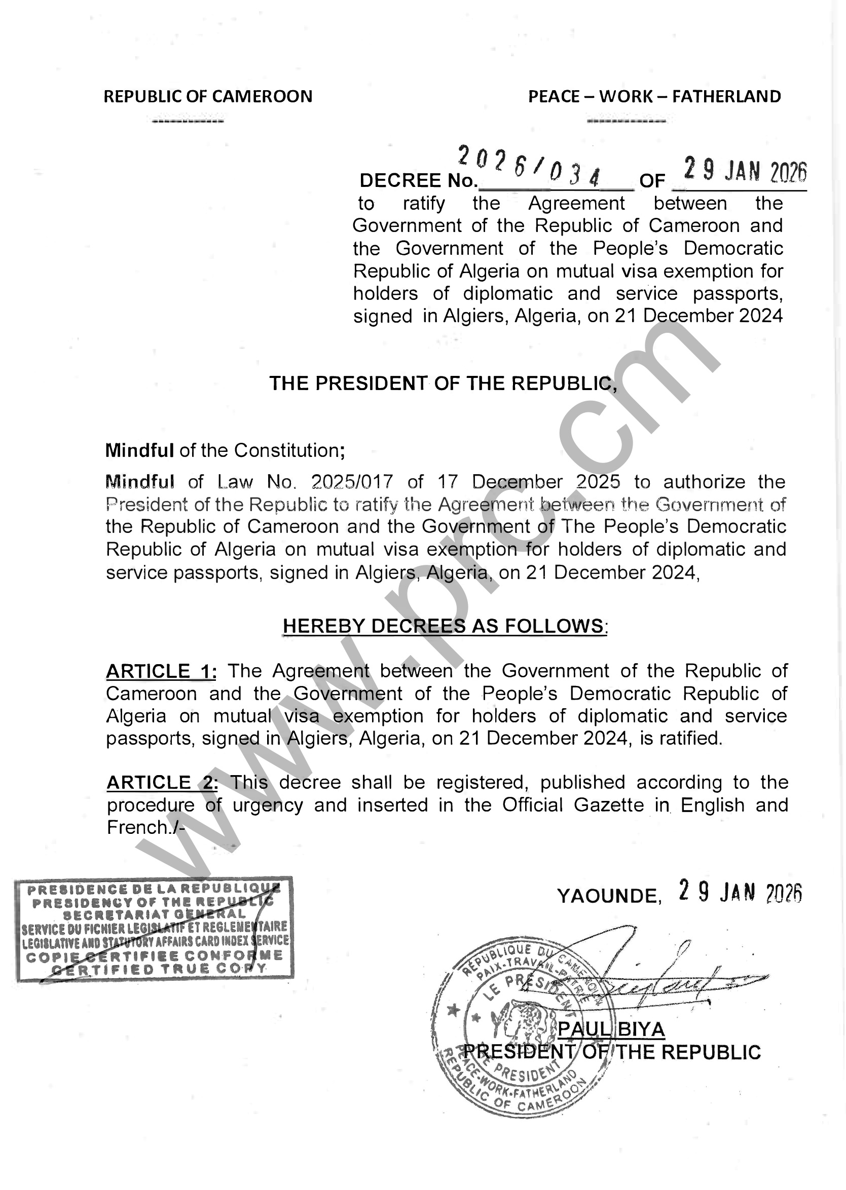 Decree No.2026/034 of 29 January 2026 to ratify the Agreement between Cameroon and Algeria on mutual visa exemption for holders of diplomatic and service passports Print Tweet Download (pdf) < Prev Next >