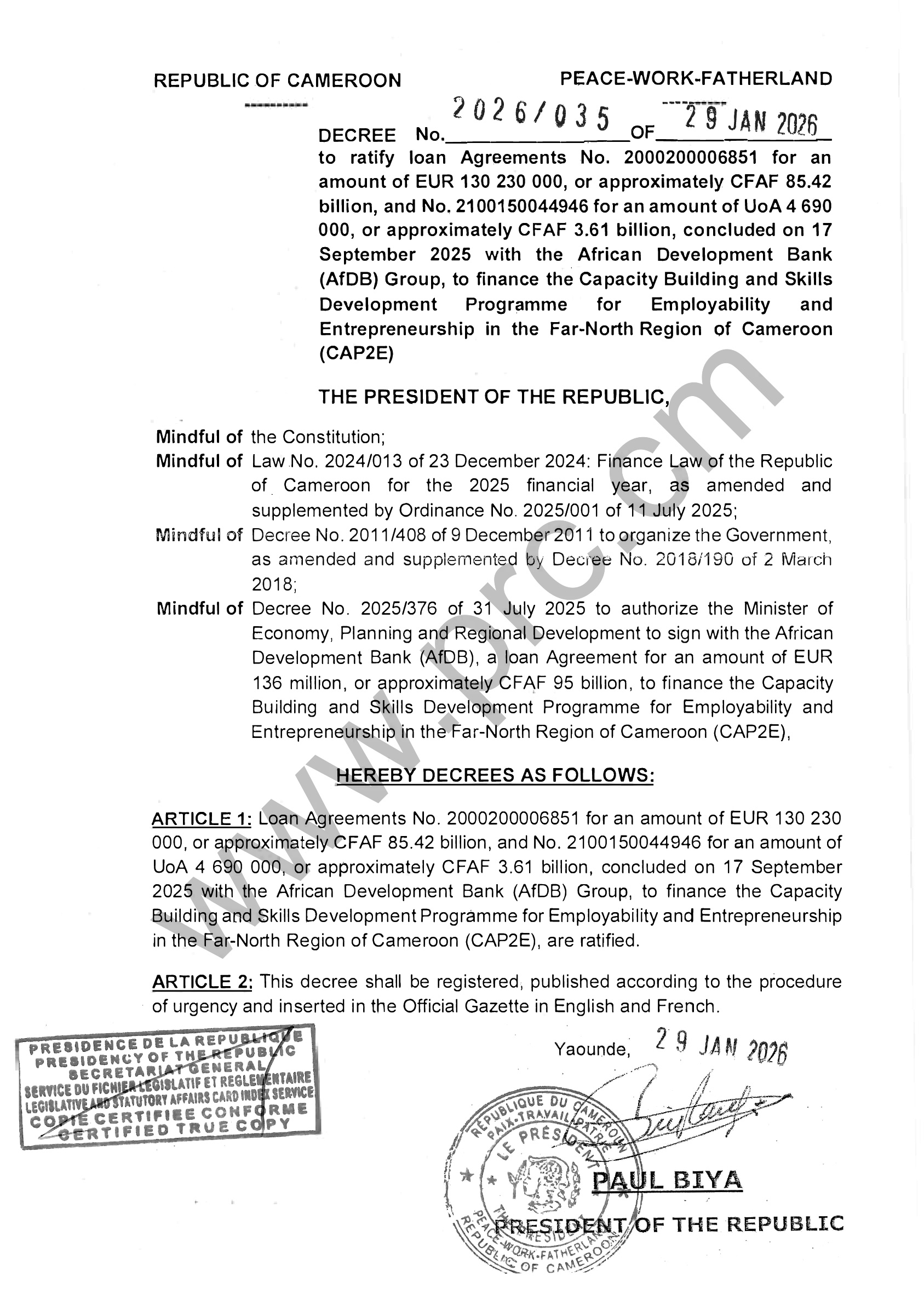 Decree No.2026/035 of 29 January 2026 to ratify loan Agreements No. 2000200006851 and No. 2100150044946 to finance the Capacity Building and Skills Development Programme for Employability and Entrepreneurship in the Far-North Region of Cameroon (CAP2E) Print Tweet Download (pdf) < Prev Next >
