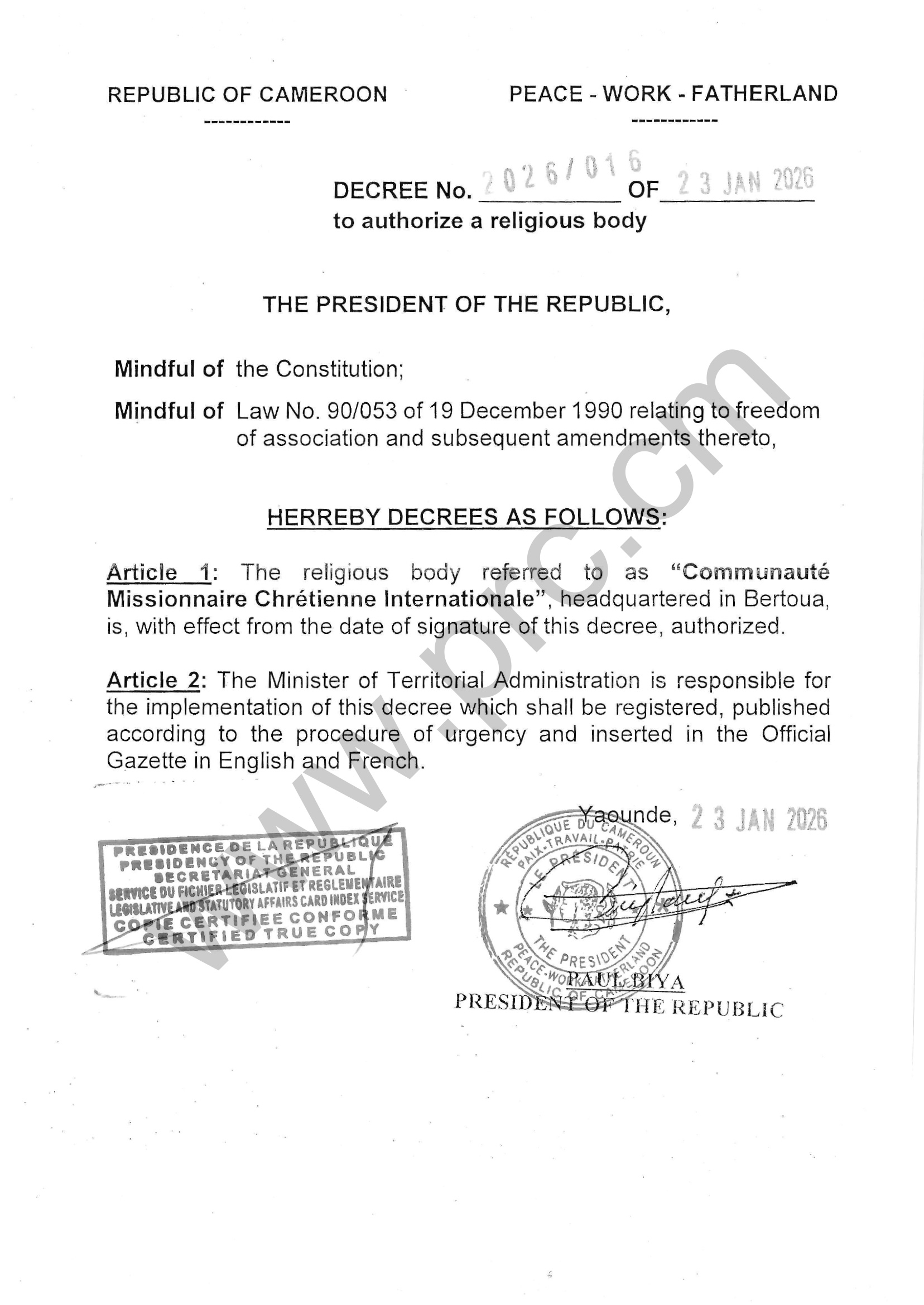 Decree No.2026/016 of 23 January 2026 to authorize the religious body referred to as "Communauté Missionnaire Chrétienne Internationale" Print Tweet Download (pdf) < Prev Next >