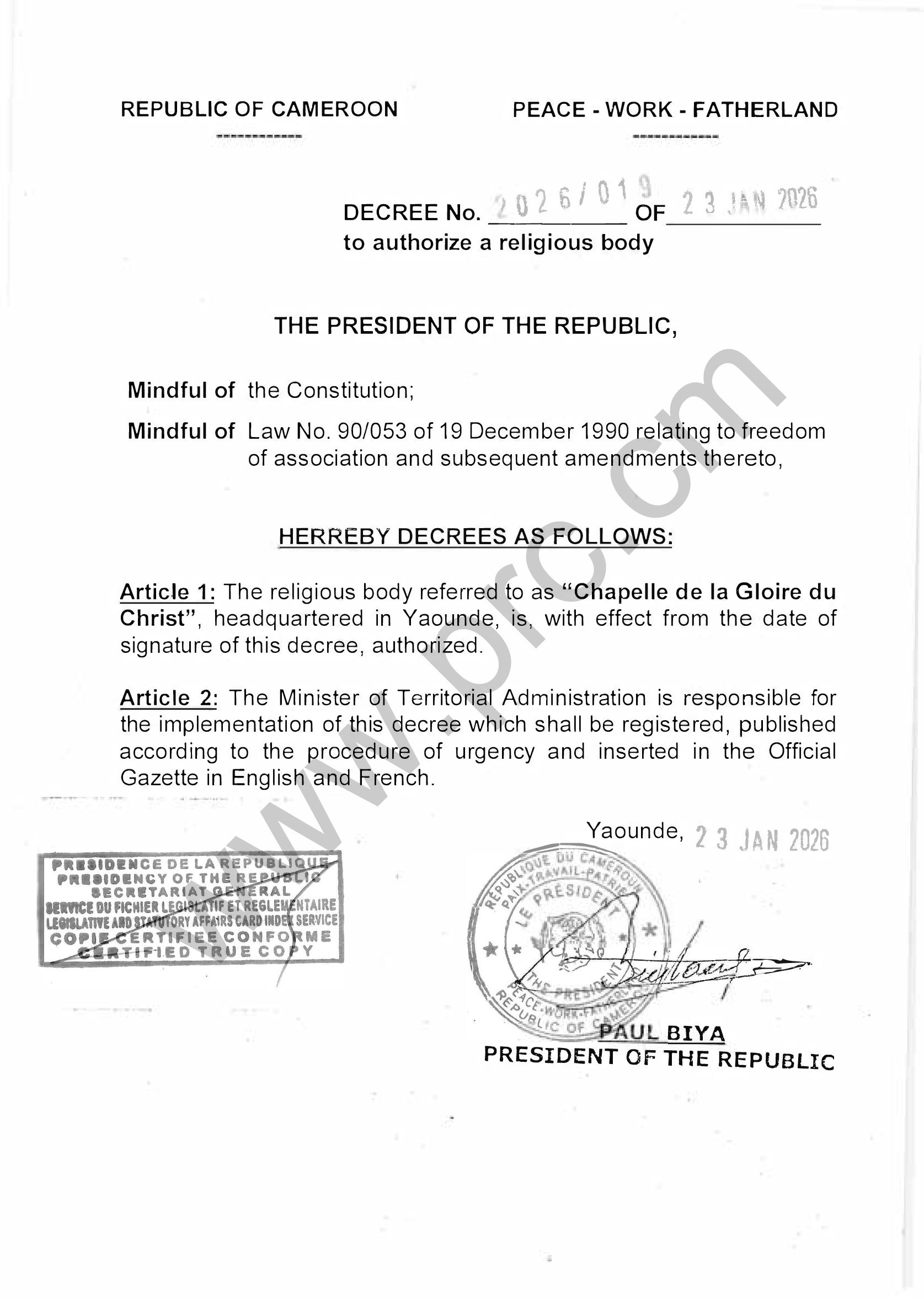 Decree No.2026/019 of 23 January 2026 to authorize the religious body referred to as "Chapelle de la Gloire du Christ" Print Tweet Download (pdf) < Prev Next >