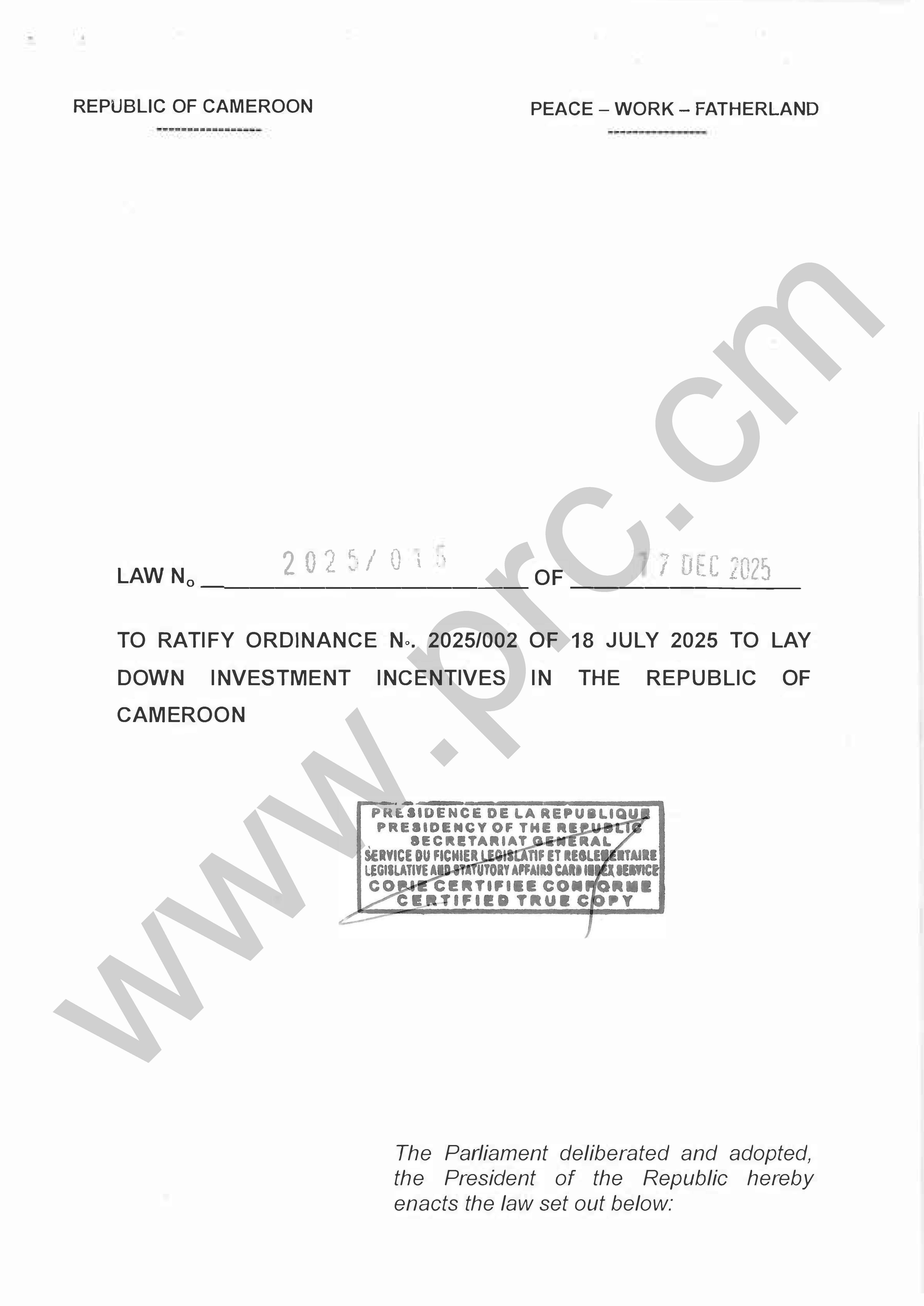 Law No.2025/014 of 17 December 2025 to ratify ordinance no.2025/001 of 11 July 2025 to amend and supplement some provisions of law no.2024/013 of 23 December 2024: finance law of Cameroon for the 2025 financial year Print Tweet Download the Law (PDF) < Prev Next >