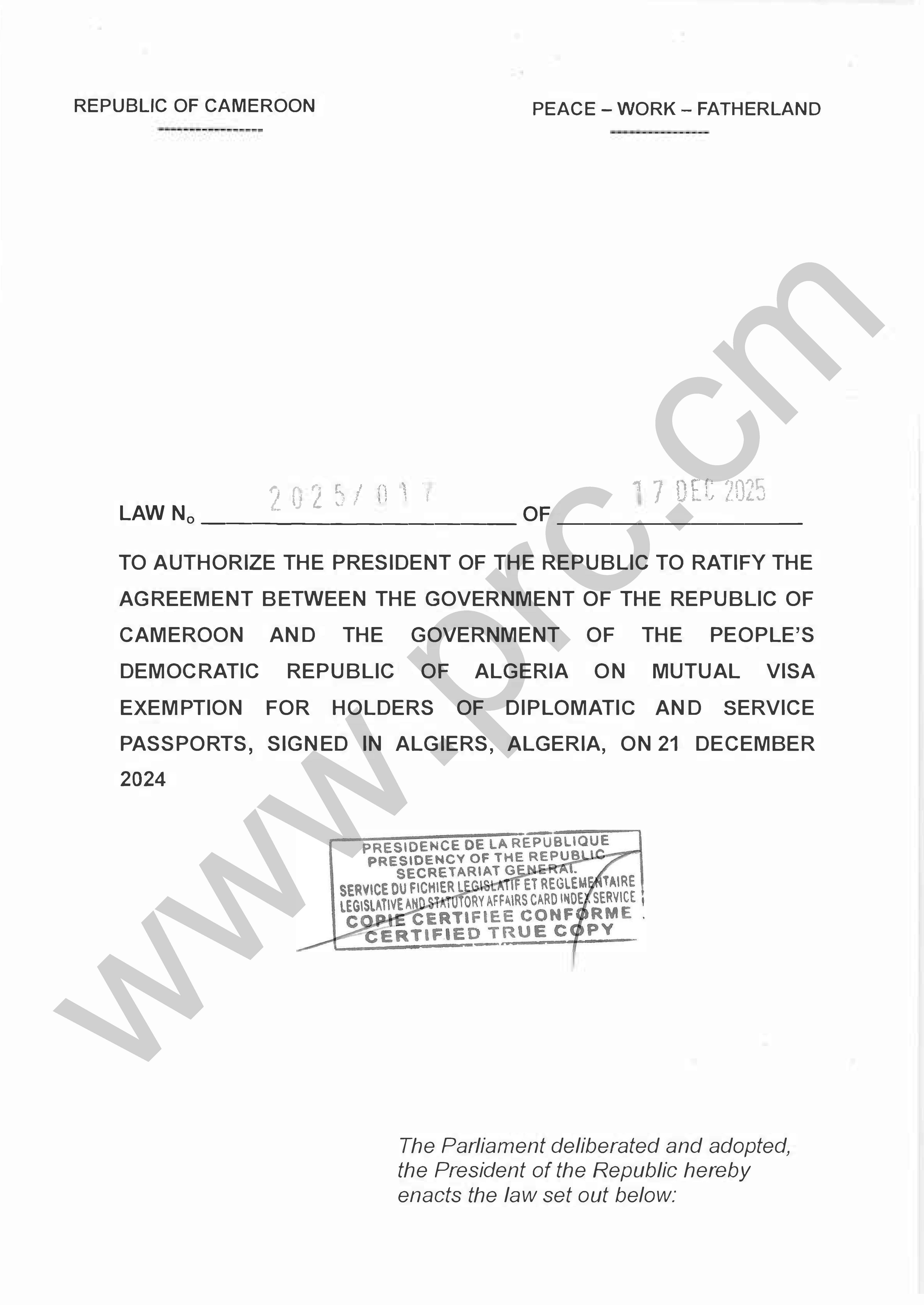 Law No.2025/017 of 17 December 2025 to authorize the President of the Republic to ratify the agreement between Cameroon and Algeria on mutual visa exemption for holders of diplomatic and service passports Print Tweet Download the Law (PDF) Next >