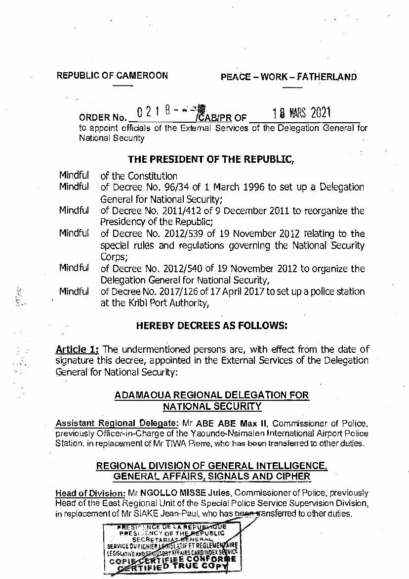 Order N° 0218/CAB/PR of 18 March 2021 to appoint officials of the External Services of the Delegation General for National Security Print Tweet Download the Order (PDF) < Prev Next >