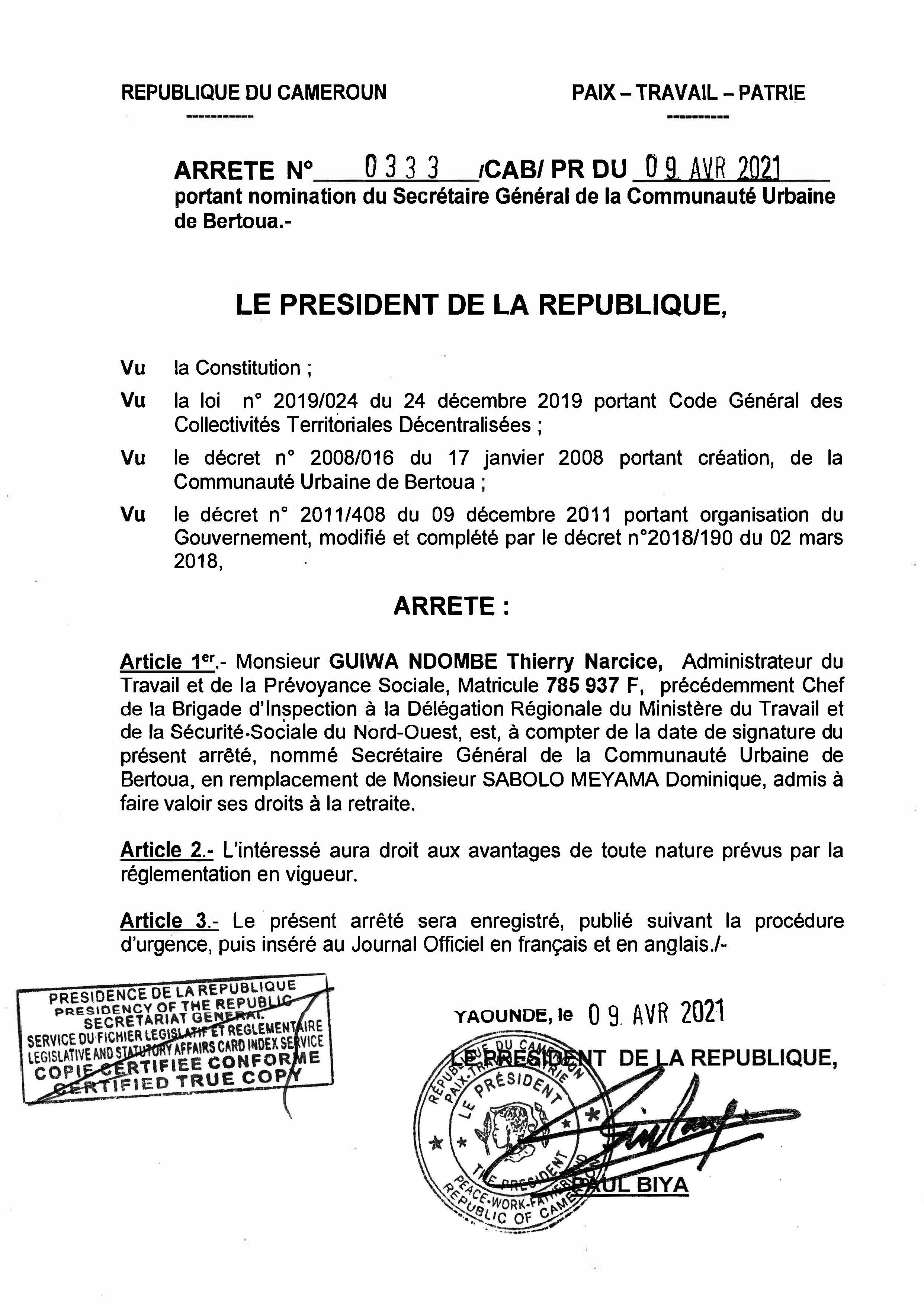 Arrêté N° 0333/CAB/PR du 09 avril 2021 portant nomination du Secrétaire Général de la Communauté Urbaine de Bertoua Imprimer Tweet Télécharger l'arrêté (PDF) < Précédent Suivant >