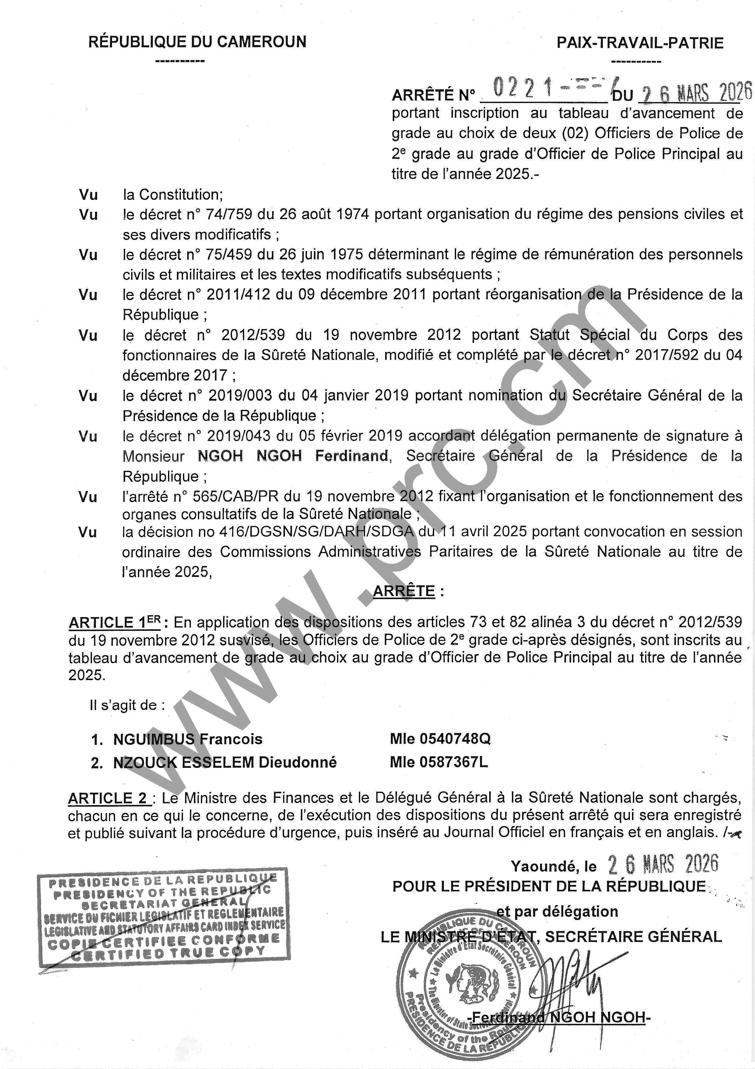 Arrêté N°0221 du 26 mars 2026 portant inscription au tableau d'avancement de grade au choix de deux (02) Officiers de Police de 2e grade au grade d'Officier de Police Principal au titre de l'année 2025 Imprimer Tweet Télécharger l'arrêté (PDF) < Précédent Suivant >