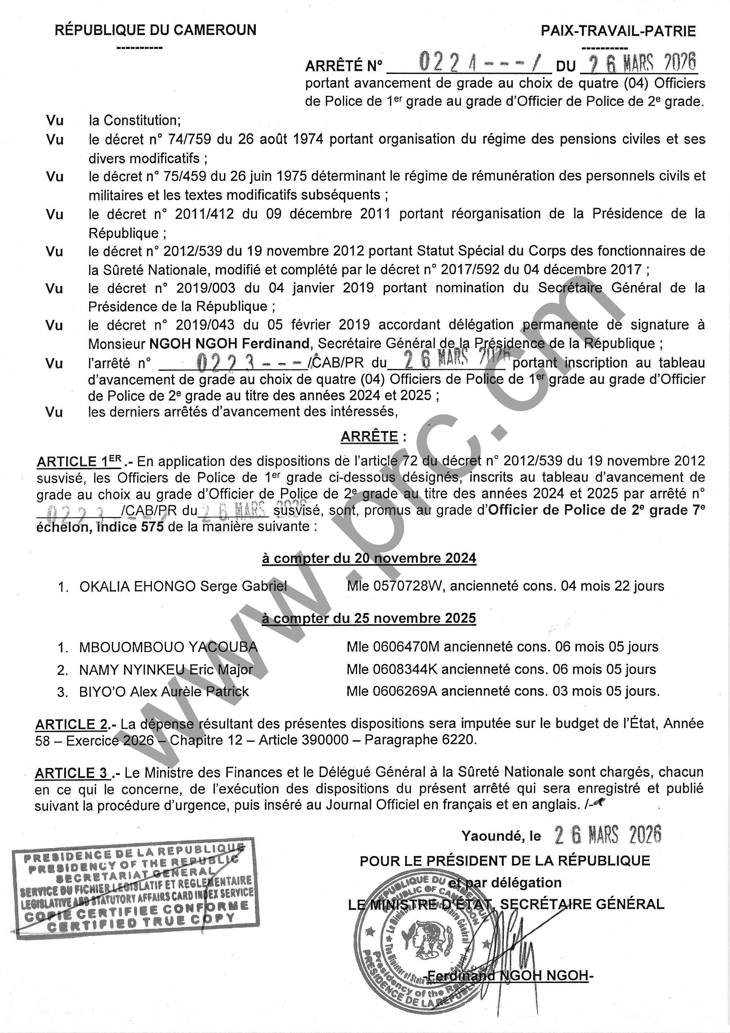 Arrêté N°0224 du 26 mars 2026 portant avancement de grade au choix de quatre (04) Officiers de Police de 1er grade au grade d'Officier de Police de 2e grade Imprimer Tweet Télécharger l'arrêté (PDF) < Précédent Suivant >