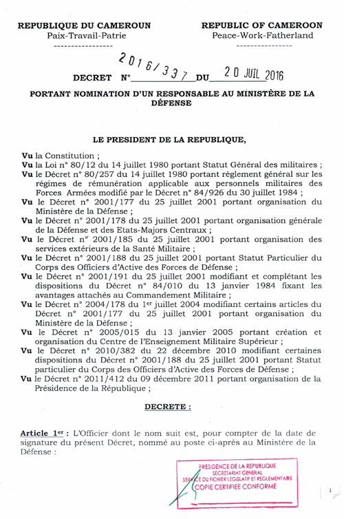Décret N° 2016/337 du 20 juillet 2016 portant nomination d'un responsable au ministère de la Défense Imprimer Tweet Télécharger l'intégralité du décret (pdf) < Précédent Suivant >