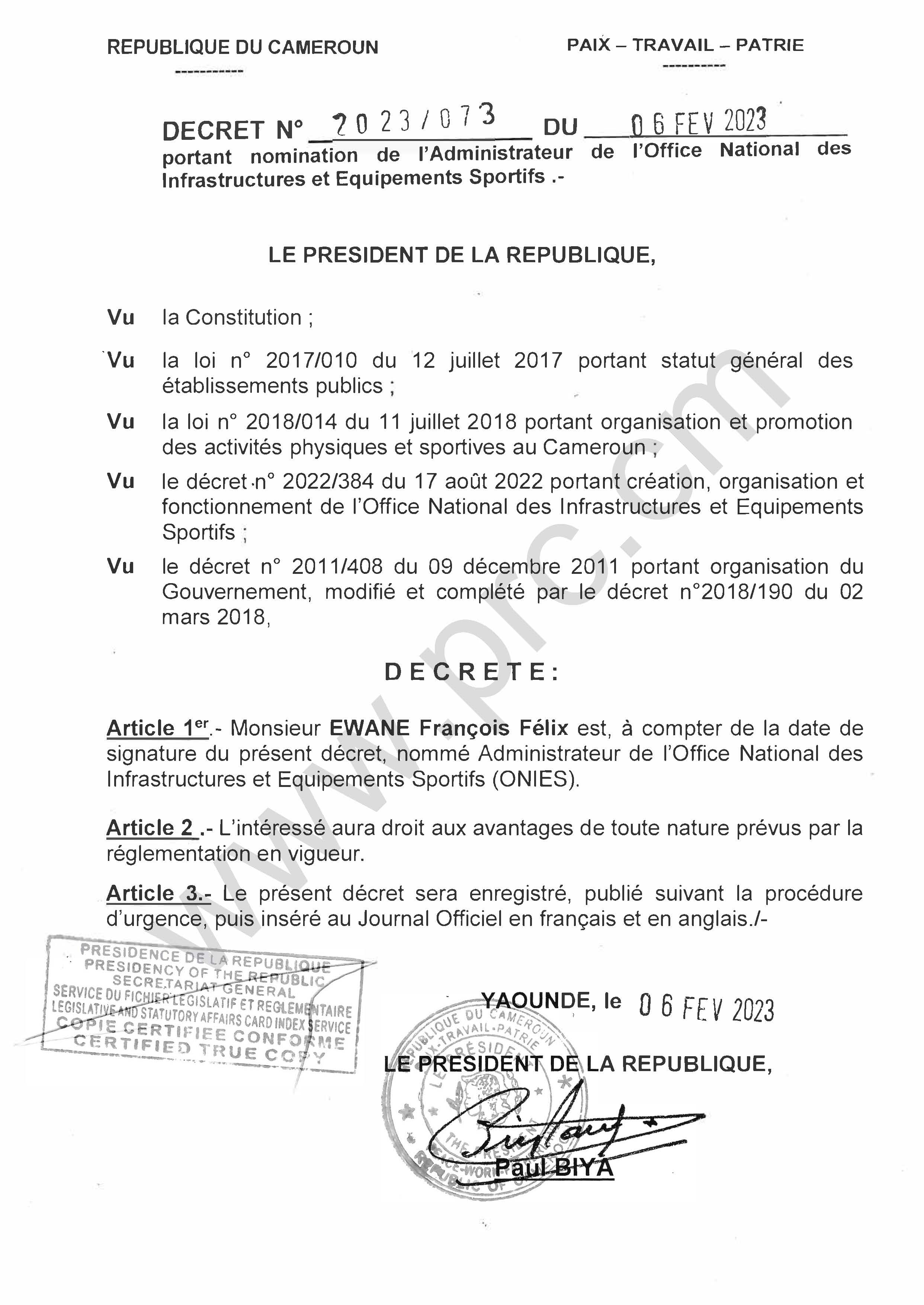 Décret N°2023/073 du 6 février 2023 portant nomination de l'Administrateur de l'Office National des Infrastructures et Equipements Sportifs Imprimer Tweet Télécharger le décret (PDF) < Précédent Suivant >