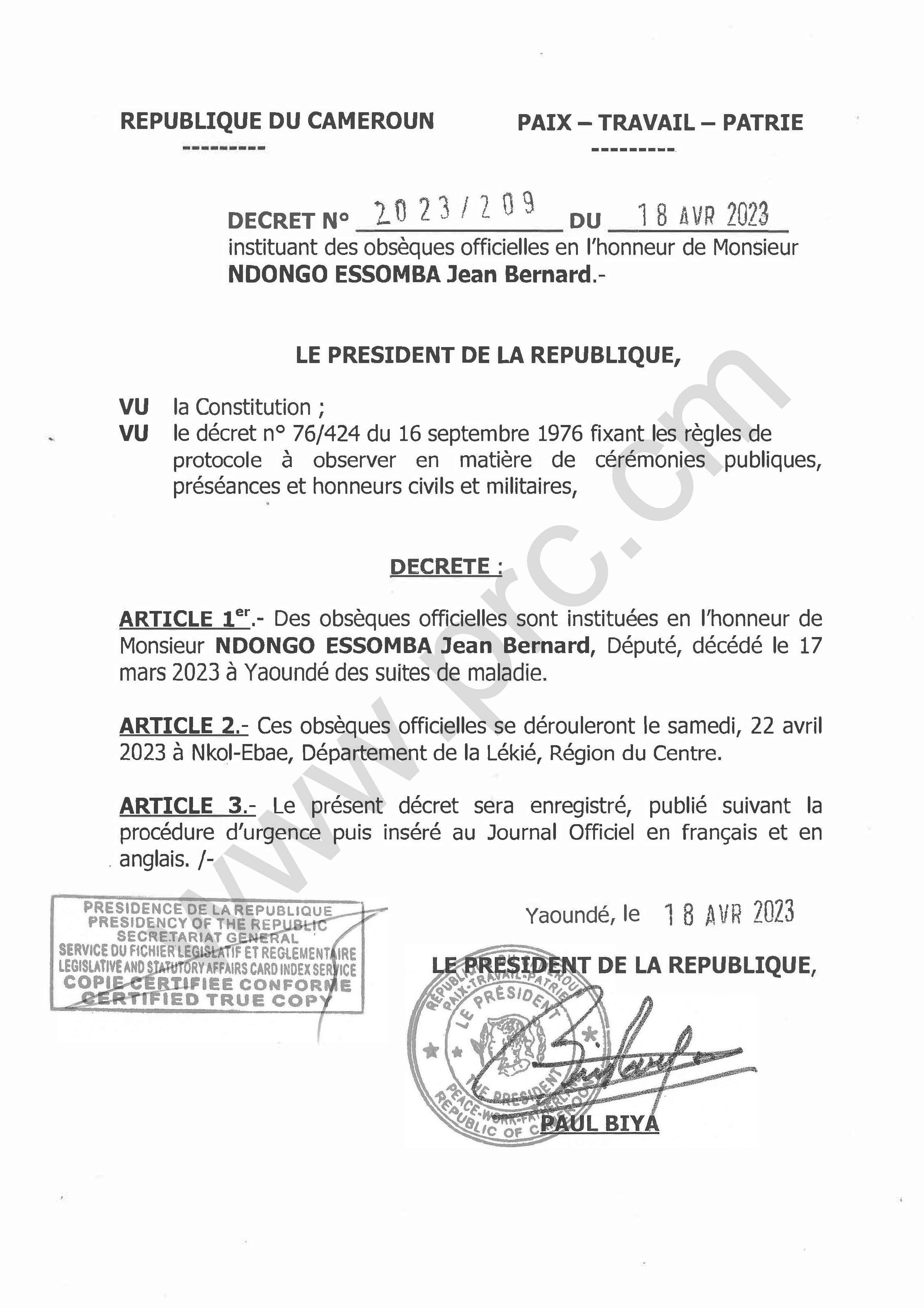 Décret N°2023/209 du 18 avril 2023 instituant des obsèques officielles en l'honneur de Monsieur NDONGO ESSOMBA Jean Bernard Imprimer Tweet Télécharger le décret (PDF) < Précédent Suivant >