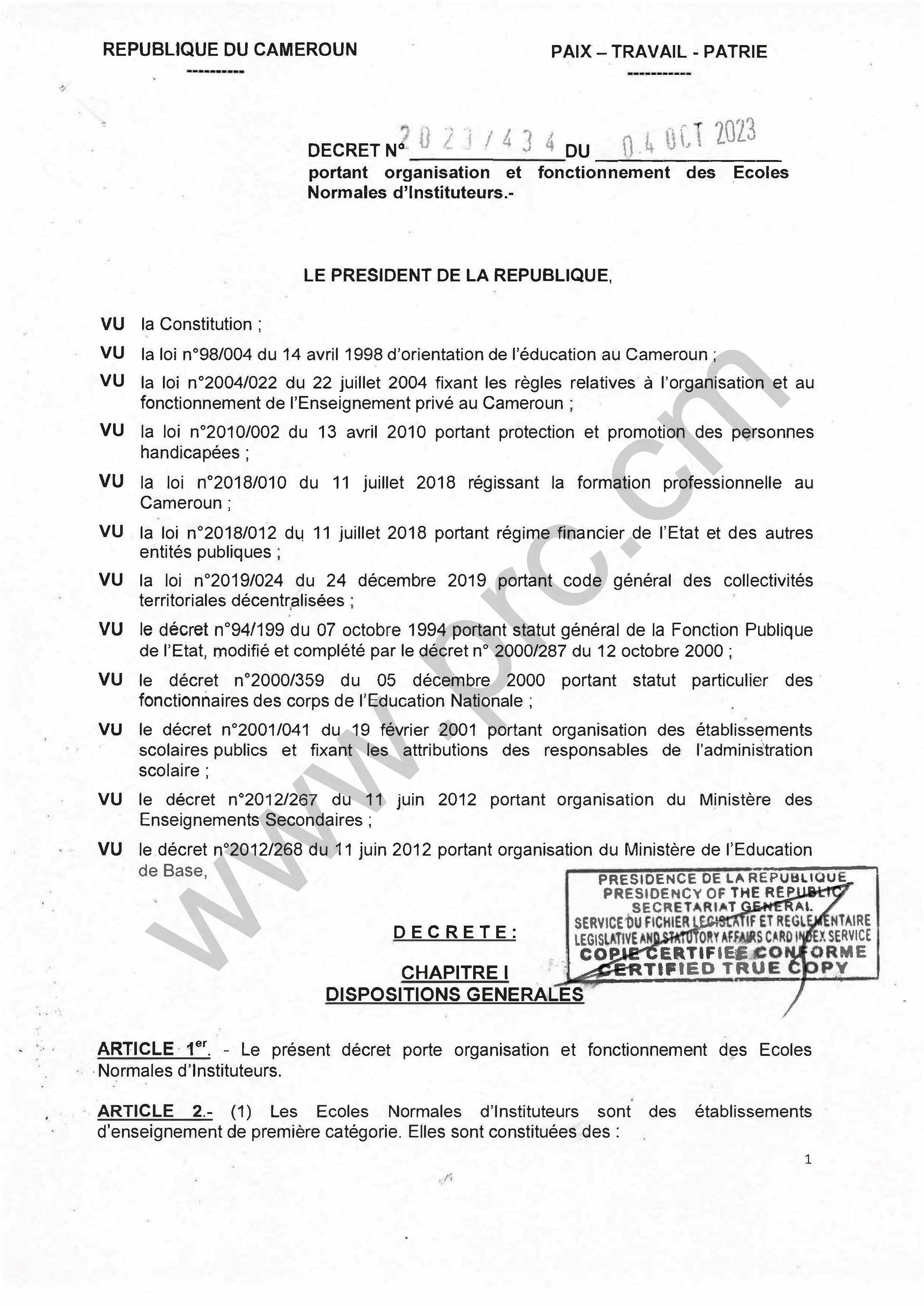 Décret N°2023/434 du 4 octobre 2023 portant organisation et fonctionnement des Ecoles Normales d'instituteurs Imprimer Tweet Télécharger le décret (PDF) < Précédent Suivant >