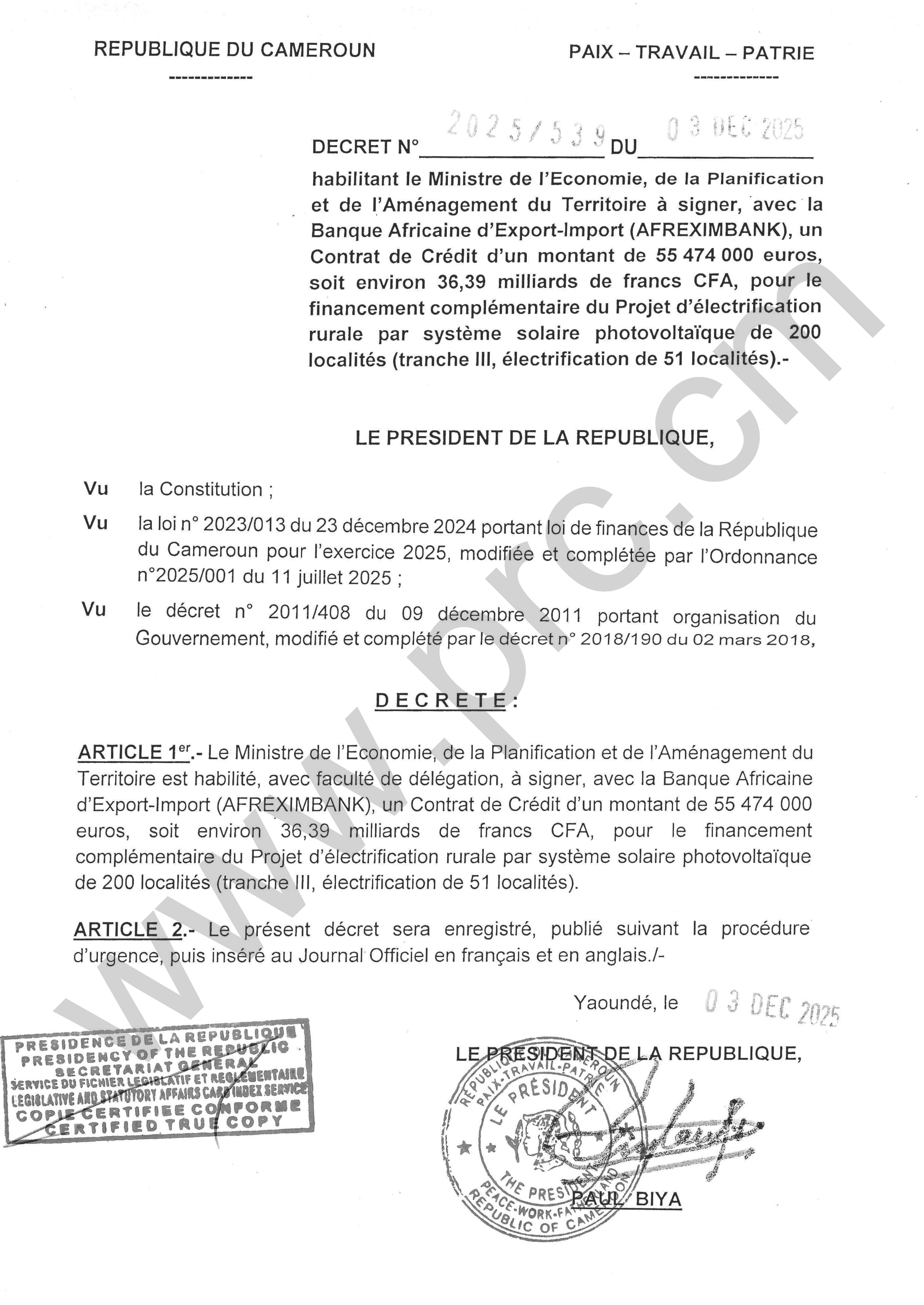 Décret N°2025/539 du 03 décembre 2025 autorisant la signature d’un Contrat de Crédit avec la Banque Africaine d'Export-Import (AFREXIMBANK), pour le financement du Projet d'électrification rurale par système solaire photovoltaïque de 200 localités Imprimer Tweet Télécharger (pdf) Suivant >
