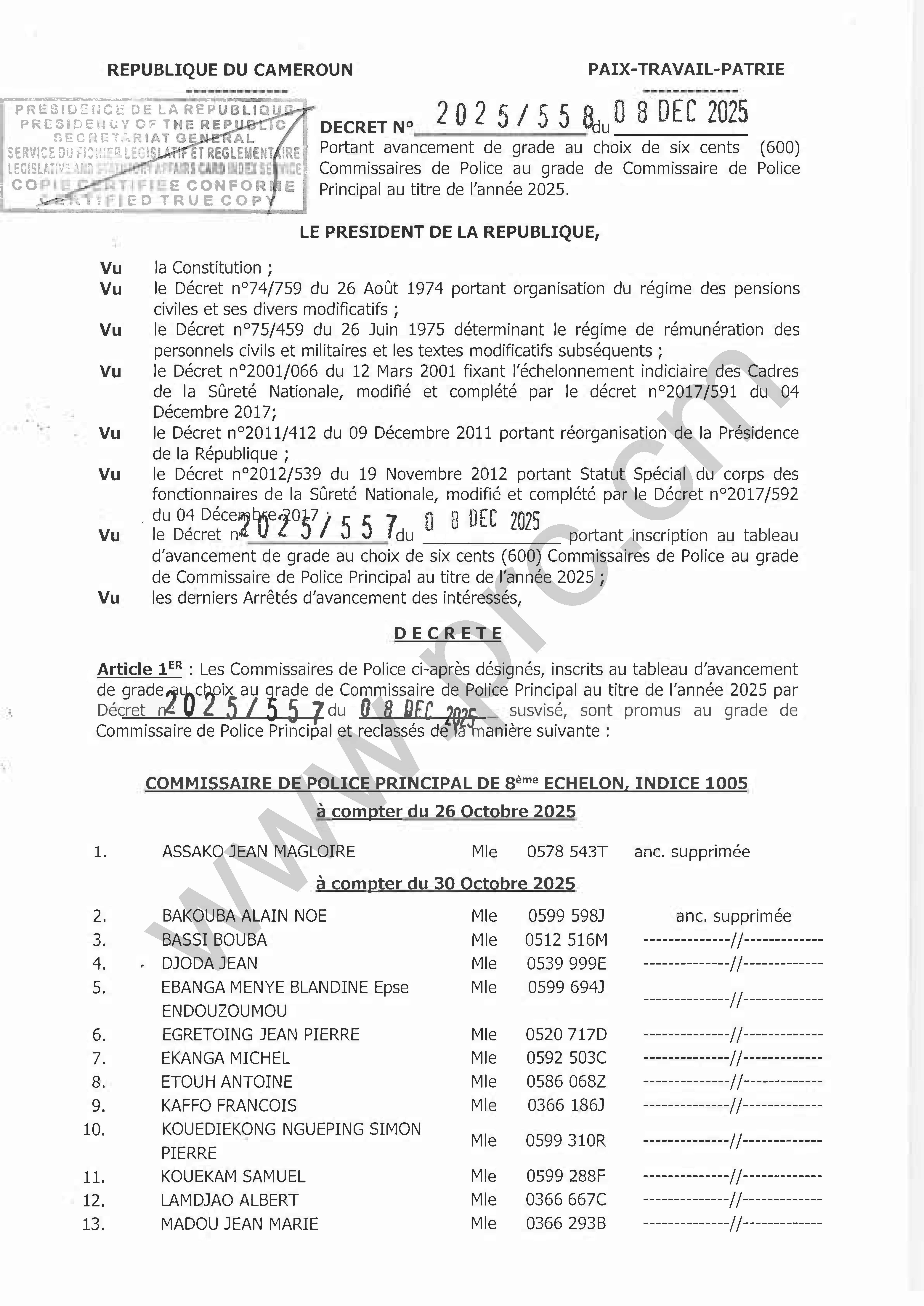 Décret N°2025/558 du 08 décembre 2025 portant avancement de grade au choix de six cents (600) Commissaires de Police au grade de Commissaire de Police Principal au titre de l'année 2025 Imprimer Tweet Télécharger l'intégralité du texte (pdf) Suivant >