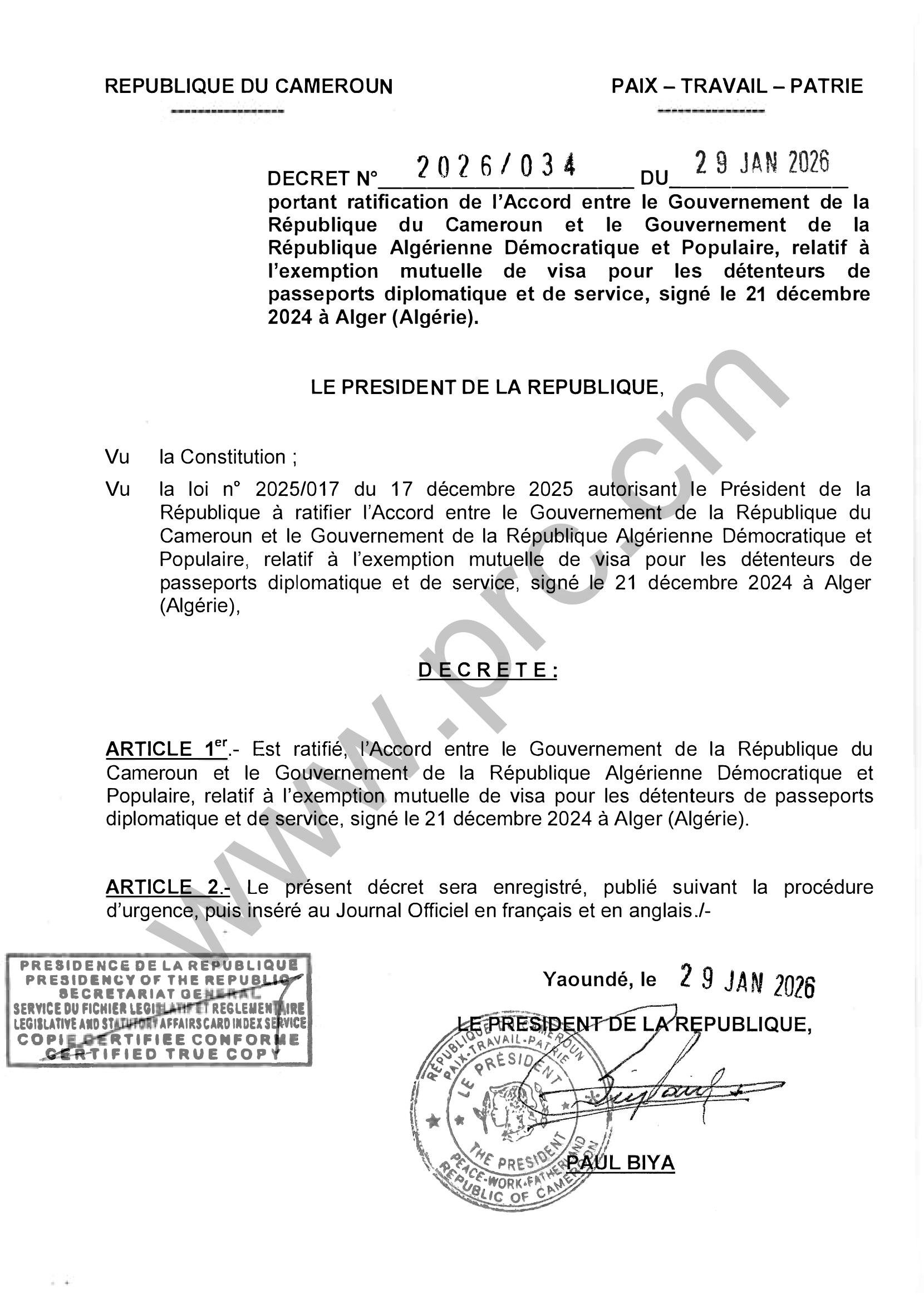 Décret N°2026/034 of 29 janvier 2026 portant ratification de l'Accord entre le Cameroun et l’Algérie, relatif à l'exemption mutuelle de visa pour les détenteurs de passeports diplomatique et de service Imprimer Tweet Télécharger (pdf) < Précédent Suivant >