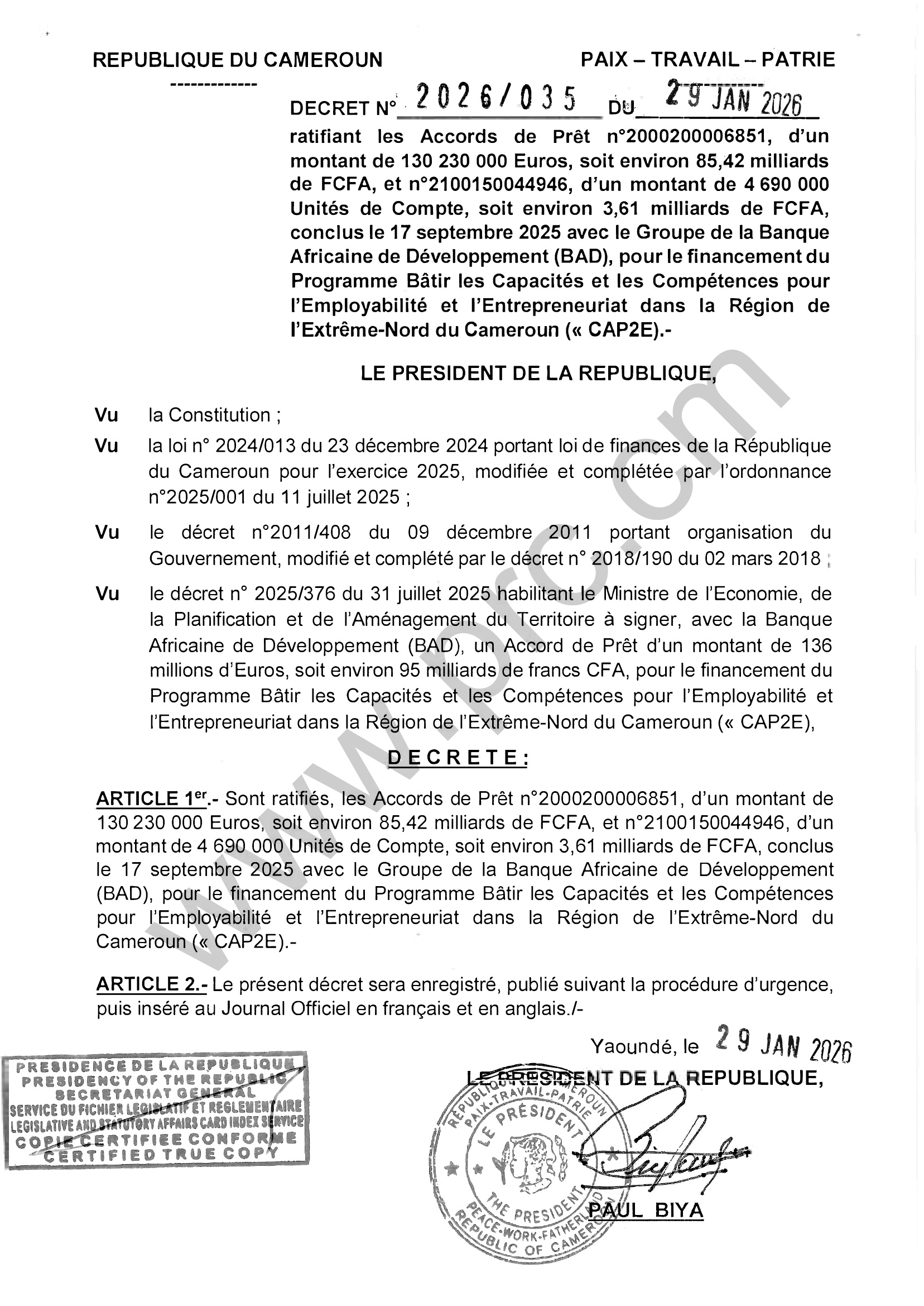 Décret N°2026/035 of 29 janvier 2026 ratifiant les Accords de Prêt n°2000200006851 et n°2100150044946, pour le financement du Programme Bâtir les Capacités et les Compétences pour l'Employabilité et l'Entrepreneuriat dans la Région de l'Extrême-Nord Imprimer Tweet Télécharger (pdf) < Précédent Suivant >