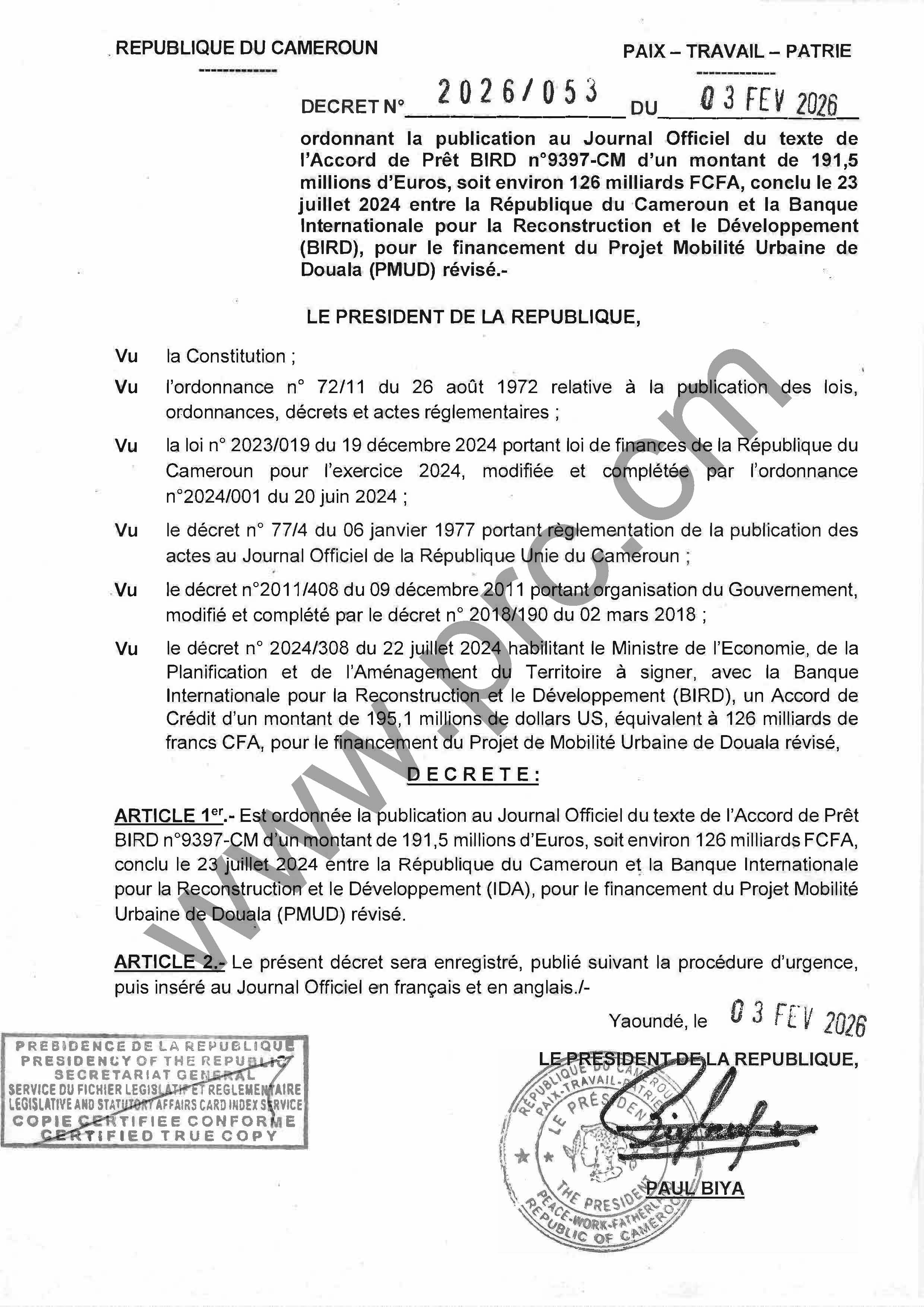 Décret N°2026/053 du 03 février 2026 ordonnant la publication au Journal Officiel du texte de l'Accord de Prêt BIRD n°9397-CM, conclu le 23 juillet 2024 pour le financement du PMUD révisé Imprimer Tweet Télécharger le décret (PDF) < Précédent Suivant >